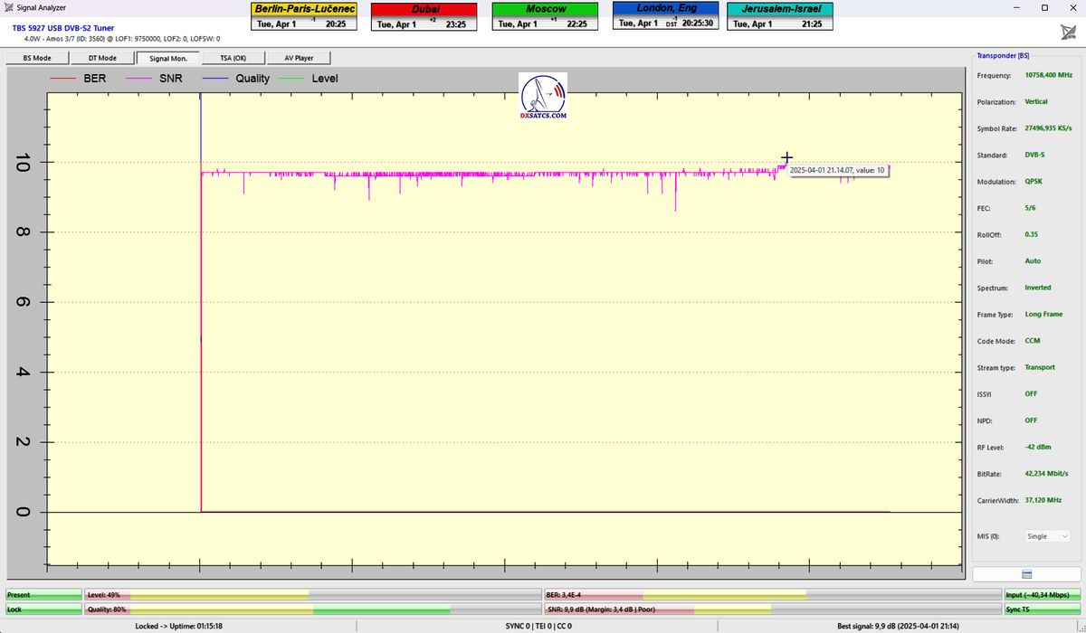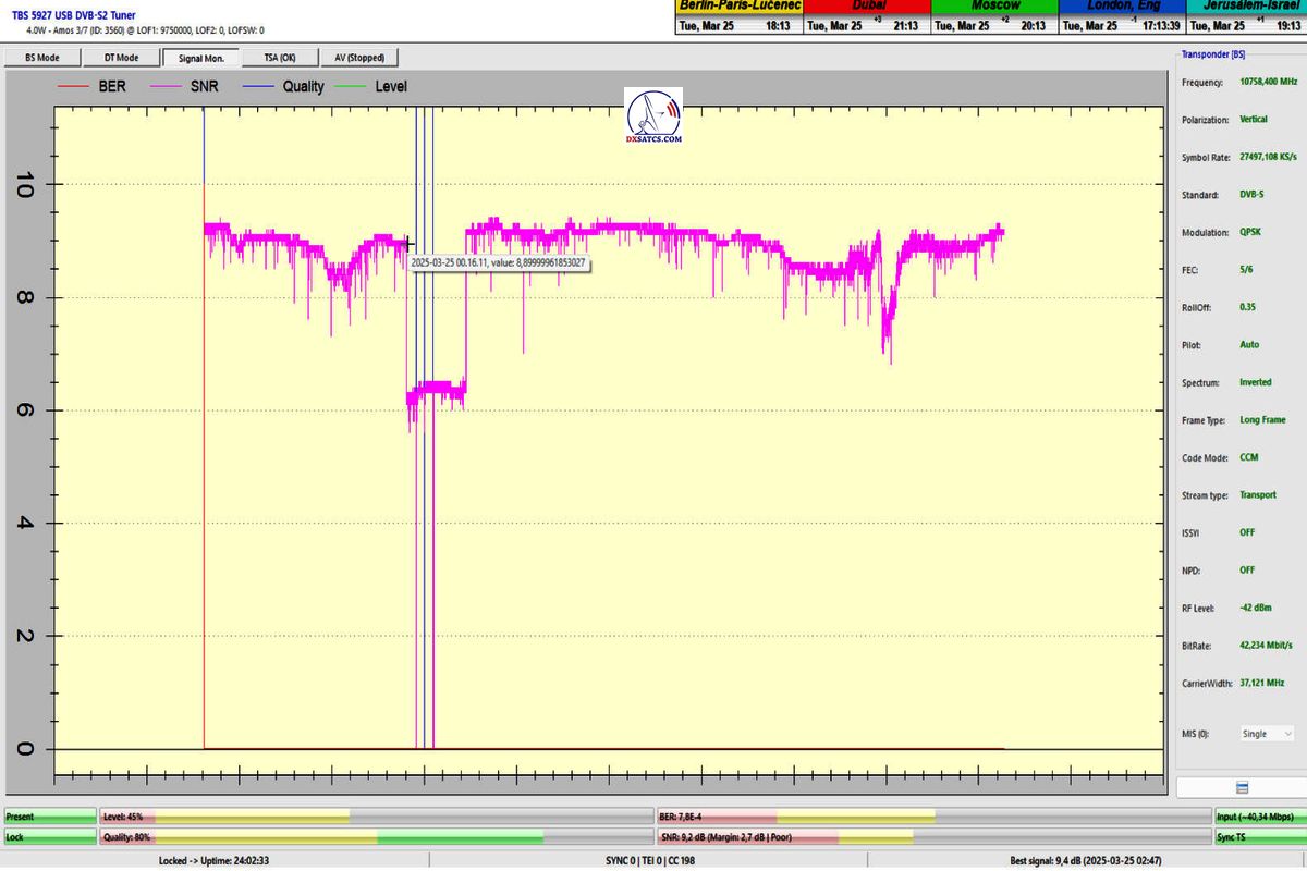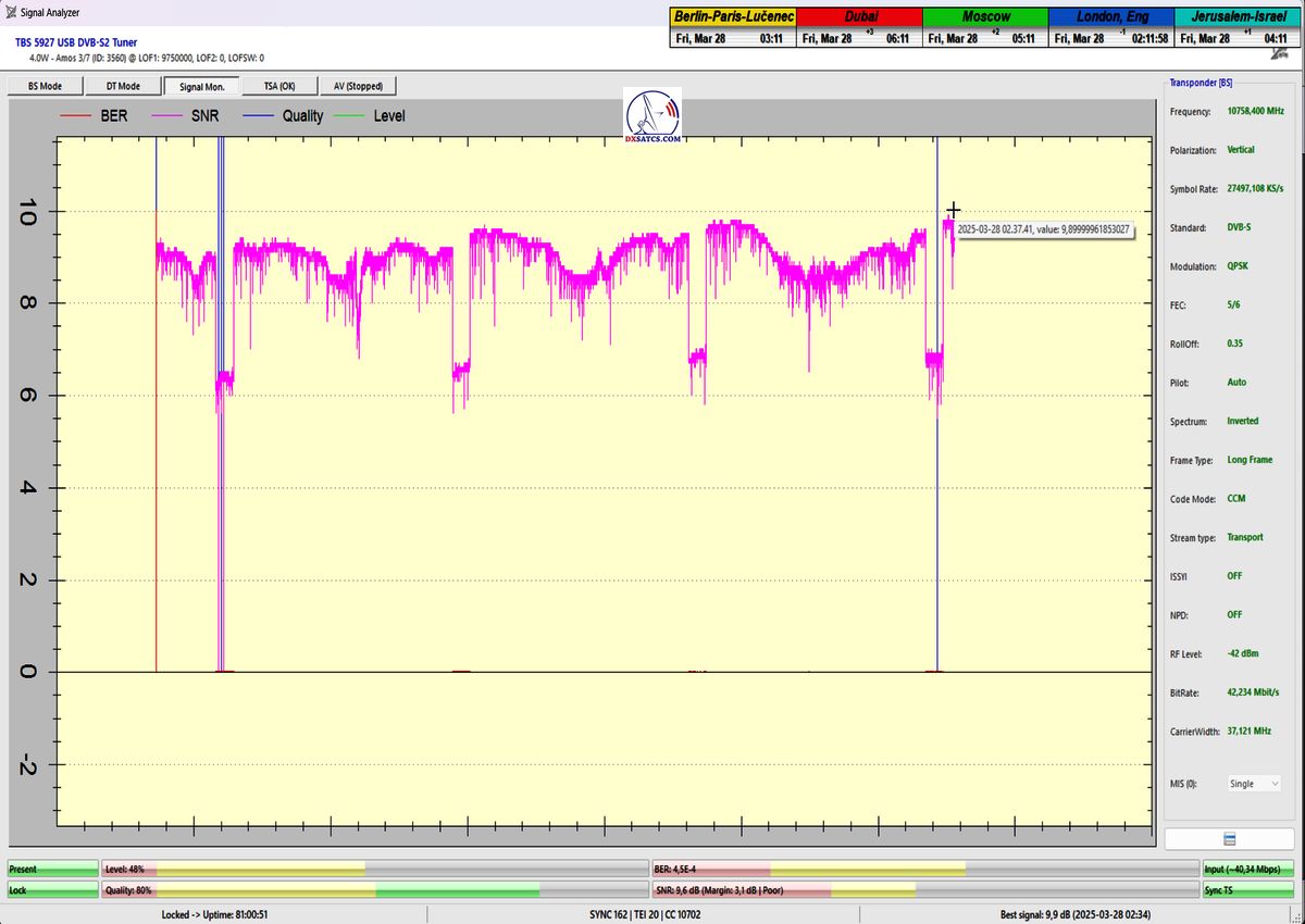 16.4.2025_YES:The highest recorded quality peak to date,MER=11 dB,in the entire measurement history of the Israeli YES waveform on f=10,758 MHz_V within the Middle East beam diagram, accompanied by a successfully decoded picturer from the NDS VideoGuard