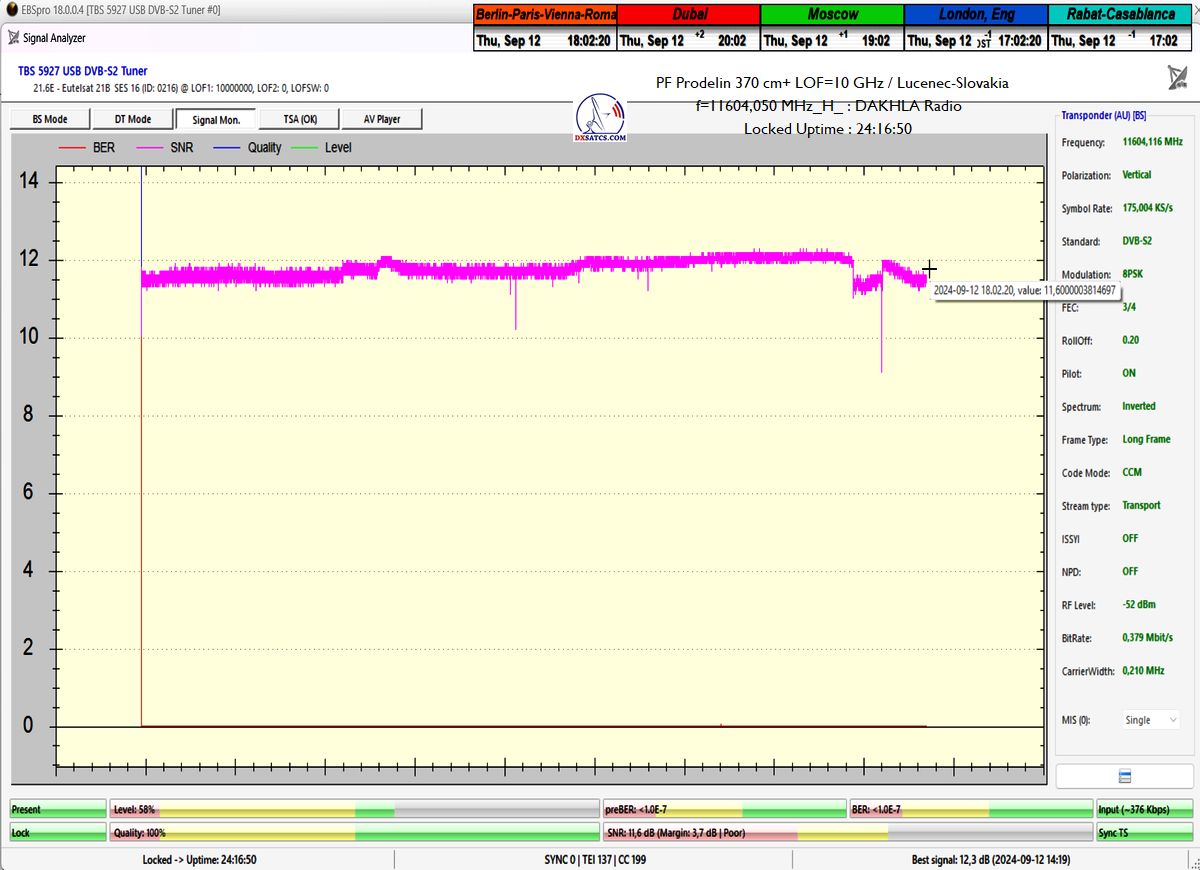 z PF 370 cm+LOF=9.75 GHz som v jednotke t=24 hodín dokázateľne dosiahol stabilitu príjmu na 100% so špičkou kvality SNR=11,9 dB,kedy nedošlo ani k jednému