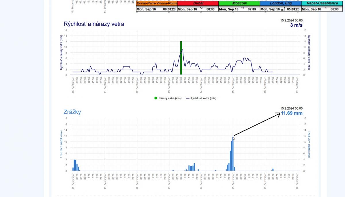 zo 14 na 15.9.2024 keď zrážková intenzita dosahovala svoje maximá v mieste príjmu,konkrétne 11,69 mm za 60 minút.Aj napriek špičke v intenzite dažďových prehánok