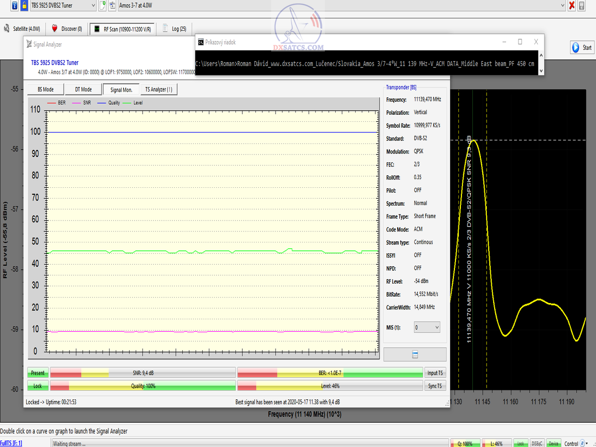 16.8.2020 : PREMIÉRA od autora Romana Dávida : PRVÝ kontinuálne prítomný (stabilne detekovatelný) LOCK nosnej KAN Izrael na f=11 113 MHz v centrálnej európskej zóne z družice AMOS 7-3.9°W s amplitúdou kvality až MER=9,2 dB ...