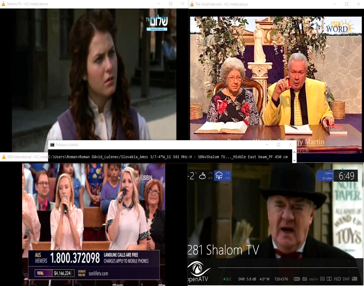 Multiplexné zobrazenie štyroch živých HD streamov a jedného verifikačného HD streamu s okamžitým stavom v signálnej kvalite odvodenej od hladiny "SNR". Konkrétne dňa 15.5.2020 signálna kvalita oscilovala v rozsahu amplitúdy MER=6-7,4 dB,čo umožňovalo stabilný príjem bez výpadkov a pixelácie v trvaní okolo 165 minút v časovom okne od 8:30 do približne 11:15 predpoludním aj napriek výrazne zhoršeným poveternostným podmienkam (dažďa),ktoré v tom čase panovali v mieste príjmu Lučenec/Slovenská republika.Signálny model pre konkrétne túto frekvenciu je aktívny takmer každý deň v rozsahu ranných  a predpoludňajších hodín,v časovom okne od 8:00 do 11.30 a.m,čiže nejedná sa o akúkoľvek formu náhodného LOCK-u nosnej,ktorého necyklickosť,alebo náhodnosť vo výskyte,vylučuje jeho zaradenie do akejkoľvek modelovej signálnej formy,alebo situácie.