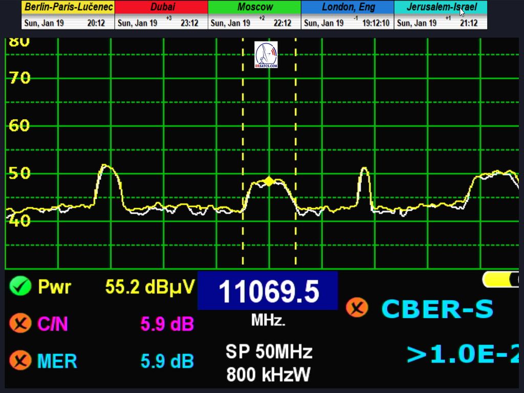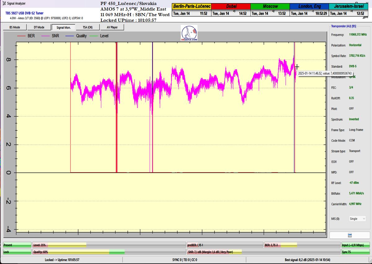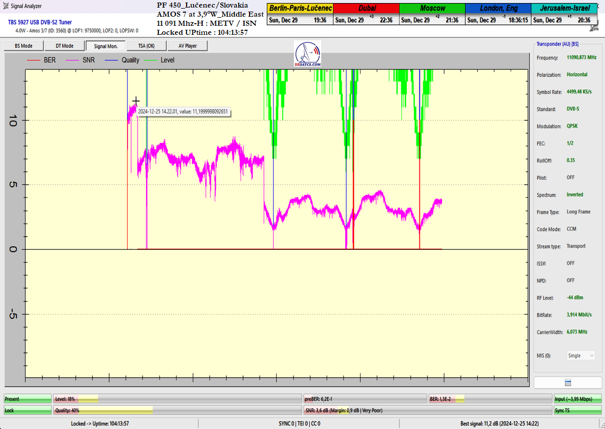 ►DE_Aus der Sicht der Erreichung einer langfristigen Signalstabilität auf dem Träger SBN/The Word Network handelt es sich um die Wellenform mit der höchsten Kanalfelderrate (ChBER) unter mitteleuropäischen Satellitenempfangsbedingungen. Anders ausgedrückt, es handelt sich um einen der technisch anspruchsvollsten Satellitenempfänge überhaupt. Trotz Schneeschauern am Empfangsort in Lučenec erreichte ich auf f = 11,069 MHz-H eine Signalstabilität von über 99 % in der Nachweiseinheit t = 100+ h.