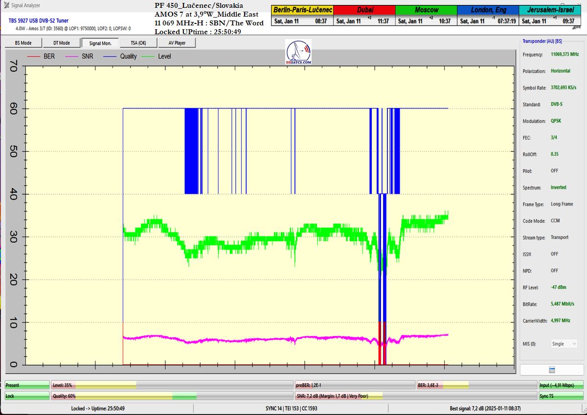 ►EN_From the perspective of achieving long-term signal stability on the SBN/The Word Network carrier, this represents the waveform with the highest channel bit error rate (ChBER) under Central European satellite reception conditions. In other words, it is one of the most technically complex satellite receptions overall. Despite snow showers at the reception site in Lučenec, I achieved signal stability exceeding 99% on f = 11,069 MHz-H within the verification unit t = 100+ h.