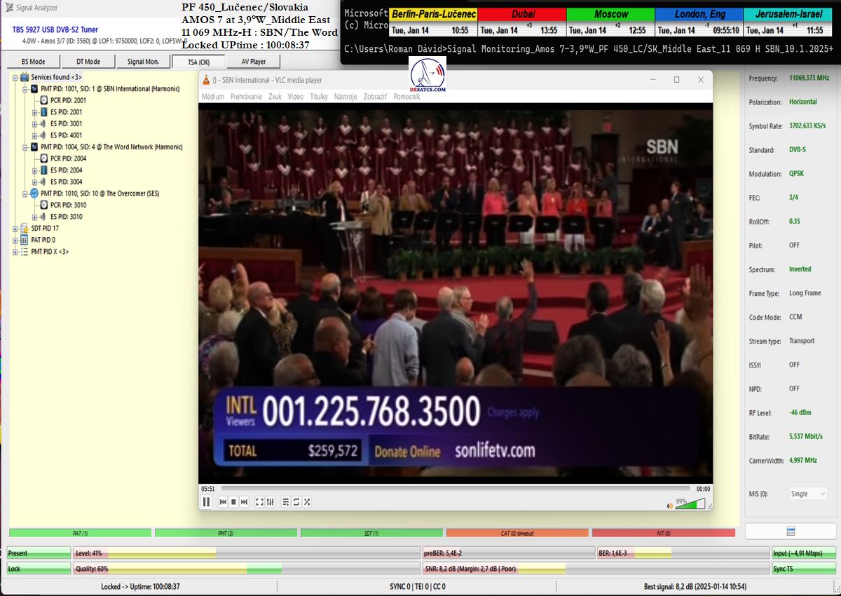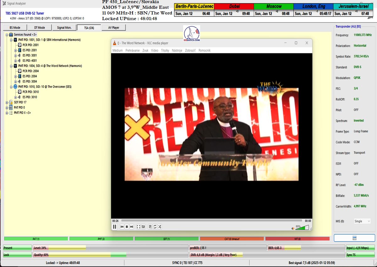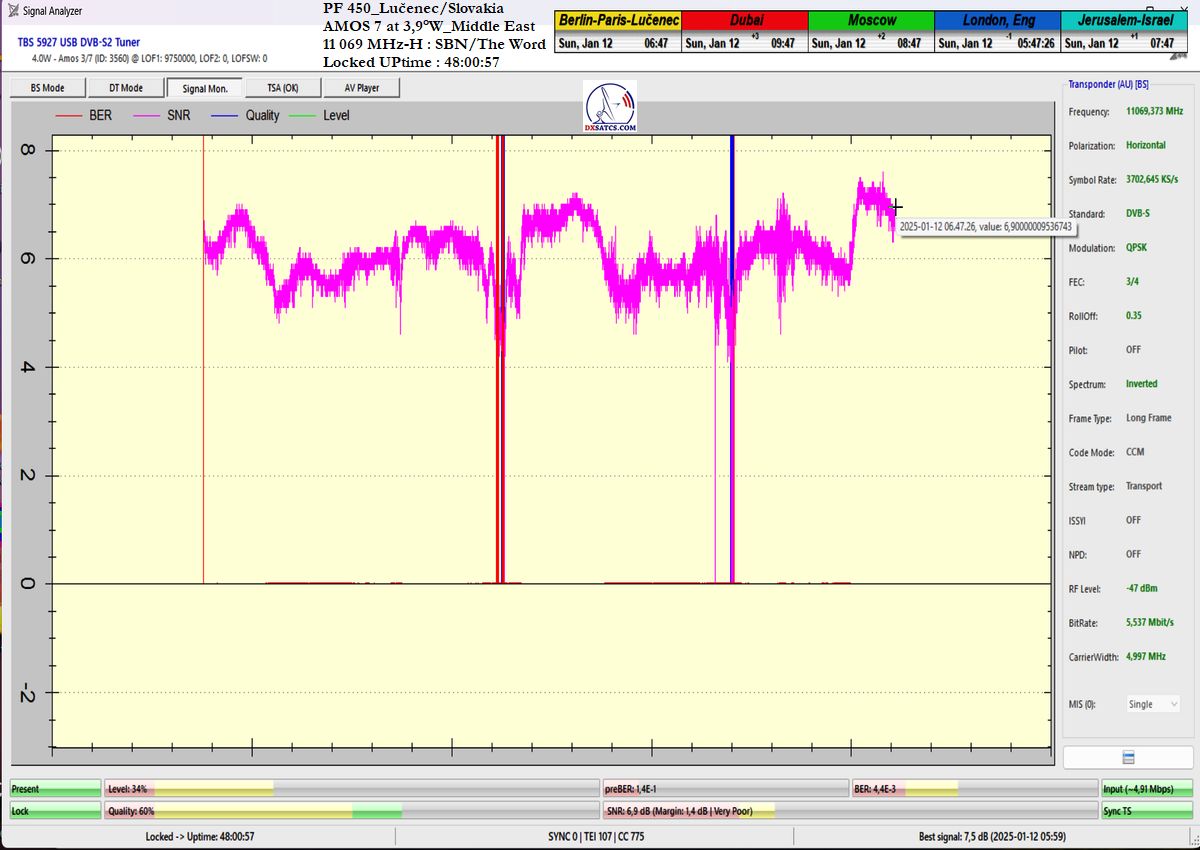 In the verification and signal monitoring period of t=101 hours, I achieved an overall reception stability of 99.40594%, expressed in percentage terms. In other words, I achieved full reception stability of SBN/The Word without a single pixelation or lock drop for a duration of 100 hours and 24 minutes out of the total 101-hour monitoring period.