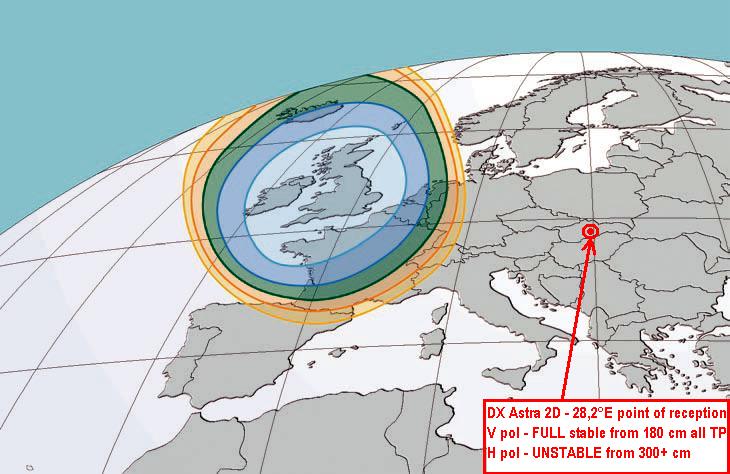 Skrátka aj keď mám osobne negatívne skúsenosti s možnosťou príjmu Astry 2D V pol prenosov s reflektormi do 200 cm v západoslovenskom kraji so 100% percentnou istotou dokiaľ v mieste príjmu nez-analyzujem frekvenčné spektrum nemôžem vopred objektívne zhodnotiť možnosť príjmu s vysokou pravdepodobnosťou zachytenia a stabilného príjmu, lebo žiadne teoretrické pravidlo,ktoré by s vysokou presnosťou dokázalo vopred určiť dostupnosť resp. možnosť zachytenia družice Astra 2D v zóne pokrynia resp.NE pokrytia signálom OUT OF FOOTPRINT - NEJESTVUJE,nakoľko ako som už viackrát pri definovaní signálneho stavu v slovenských podmienkach príjmu popisoval platí tu pravidlo o jednoznačne meratelných rozdieloch v signálnej kvalite v jednotlivých regiónoch Slovenska pri prenosoch Vertikál-Vertikál ale aj Horizontál-Horizontál !!!