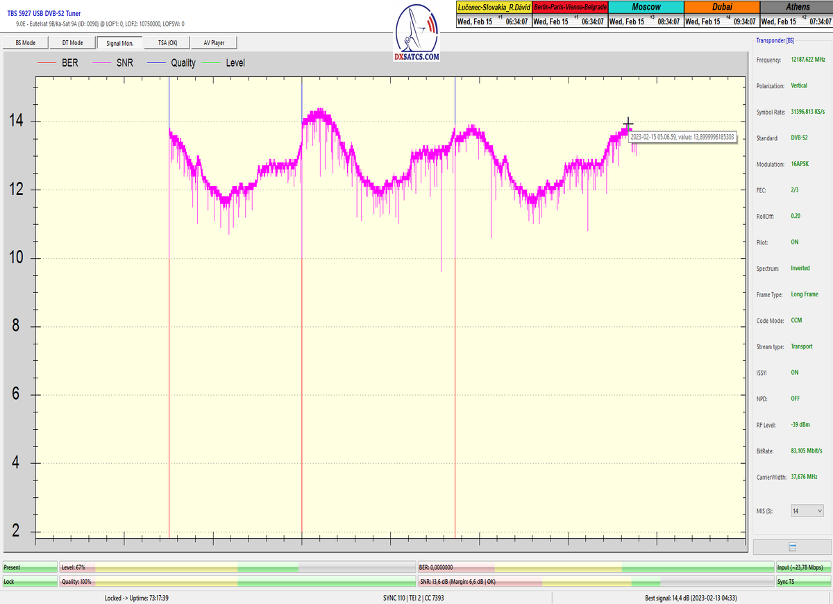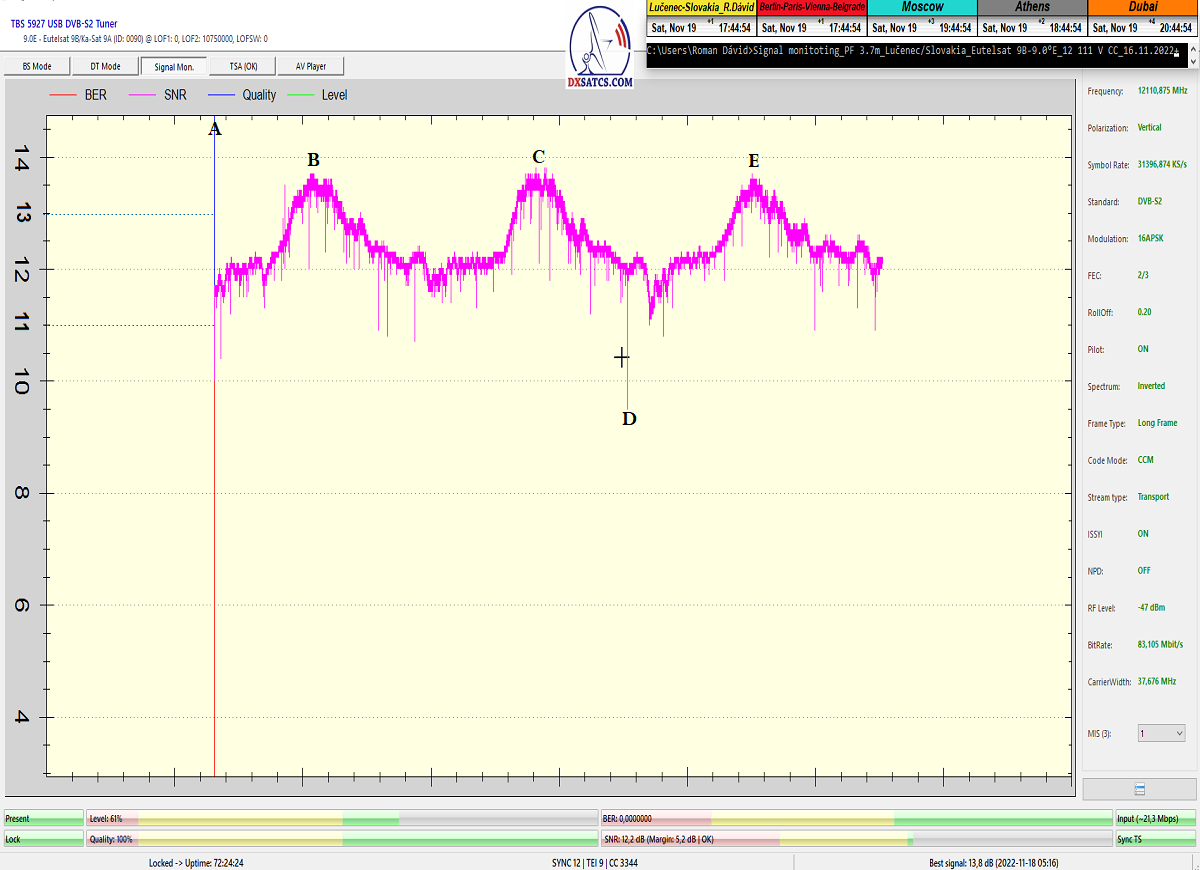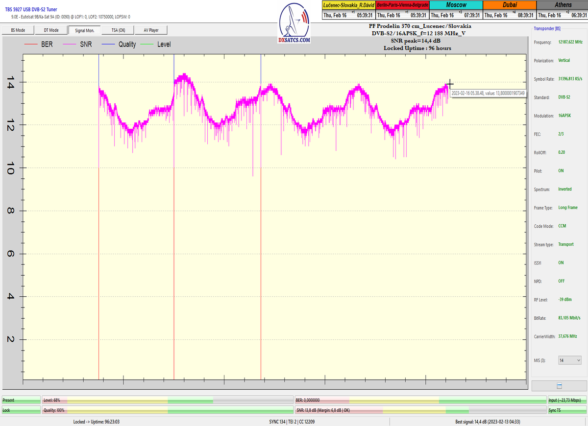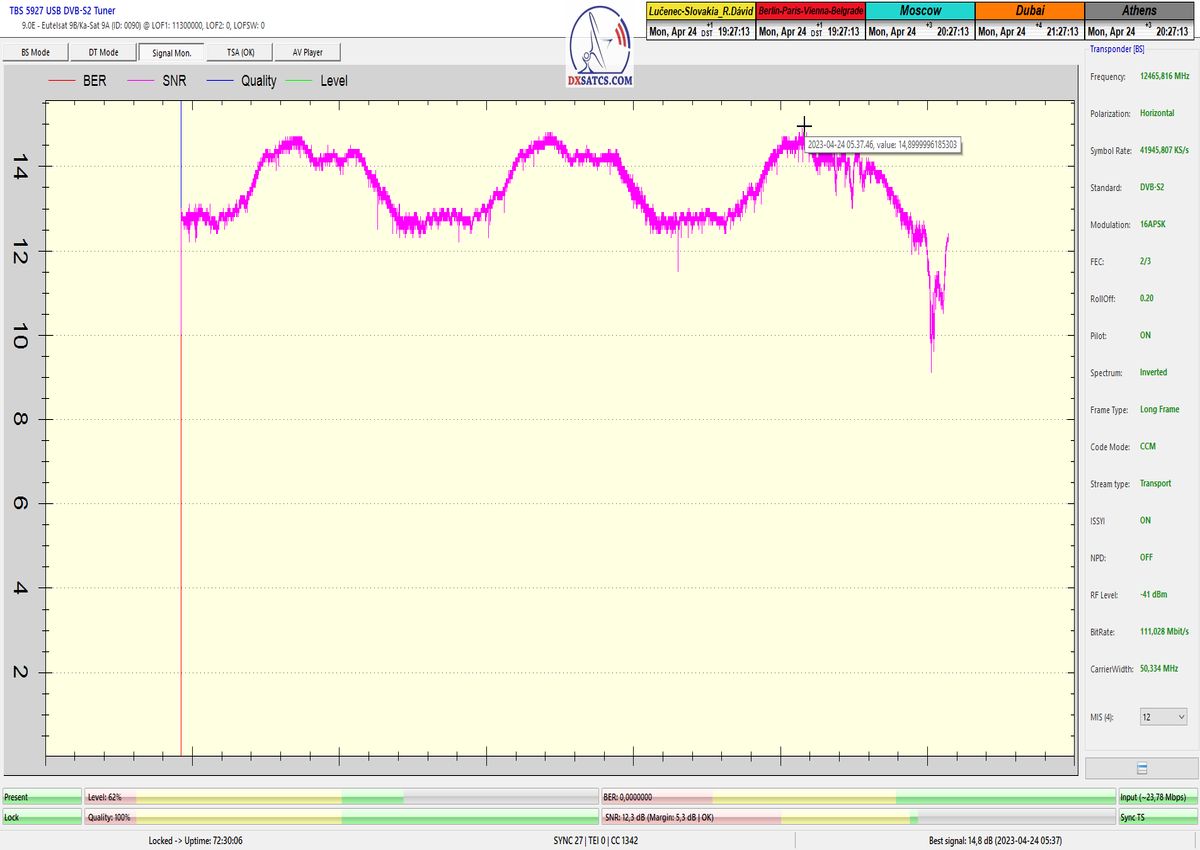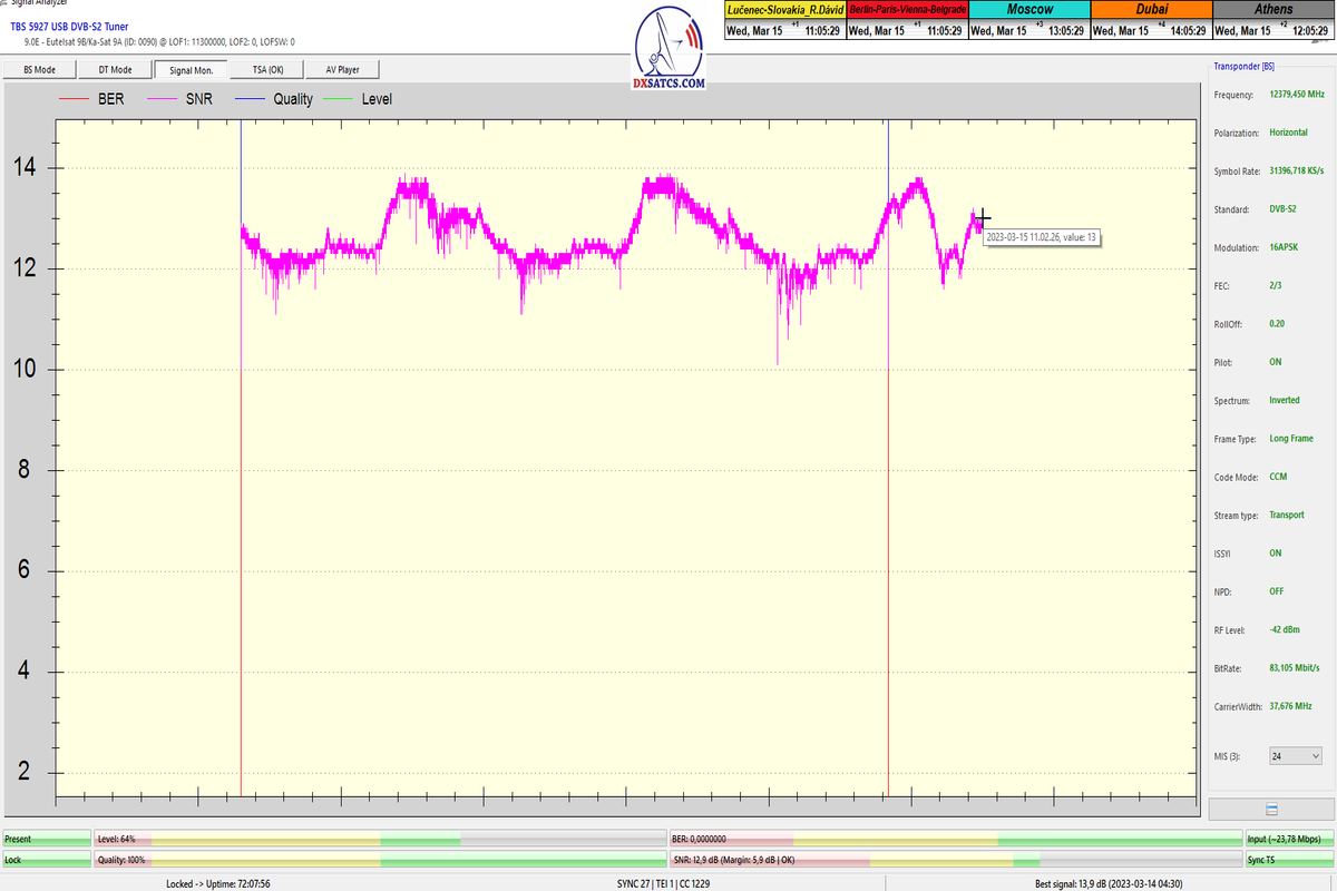 ►v signálnom monitoringu dokázaný a plne stabilný príjem bez jediného výpadku za jednotku t=72 hodín,pri častých dažďových prehánkach a každodenne dosiahnutá špička kvality okolo SNR=13,8 dB s tunerom TBS 5925/5927 alebo okolo MER=14,2 s analyzátorom Metek HD na f=12 111 V .