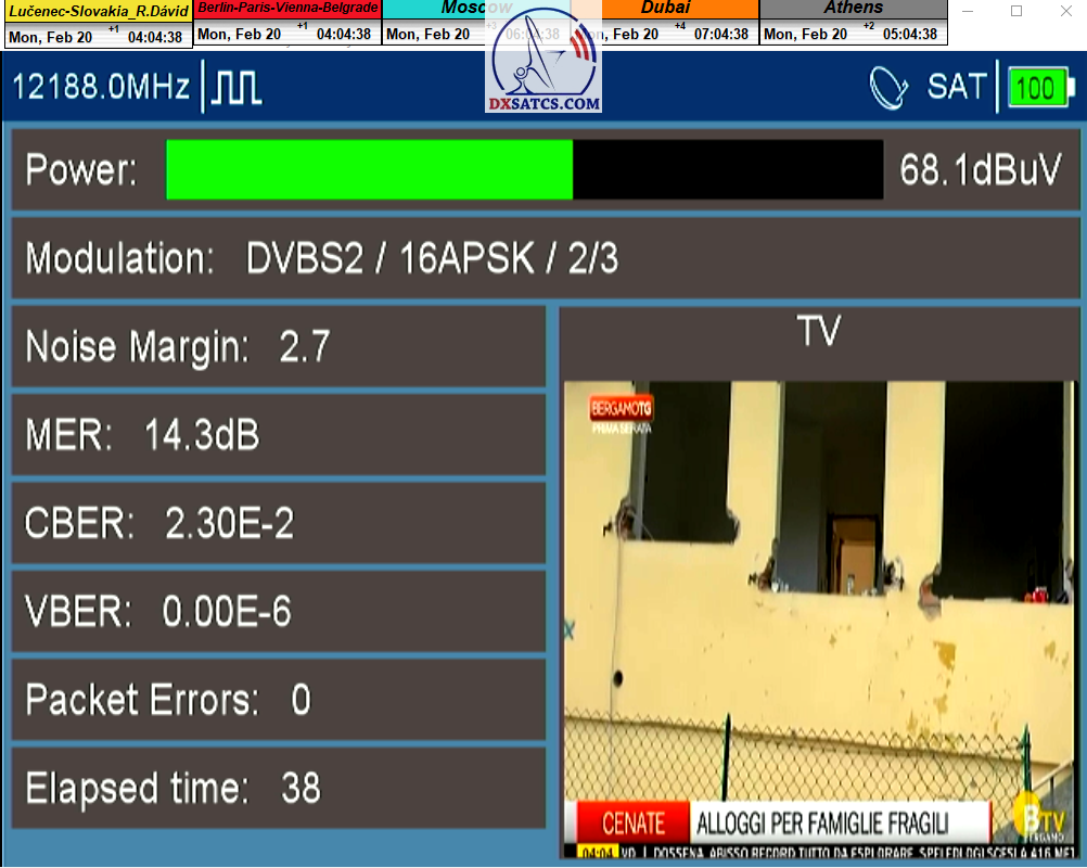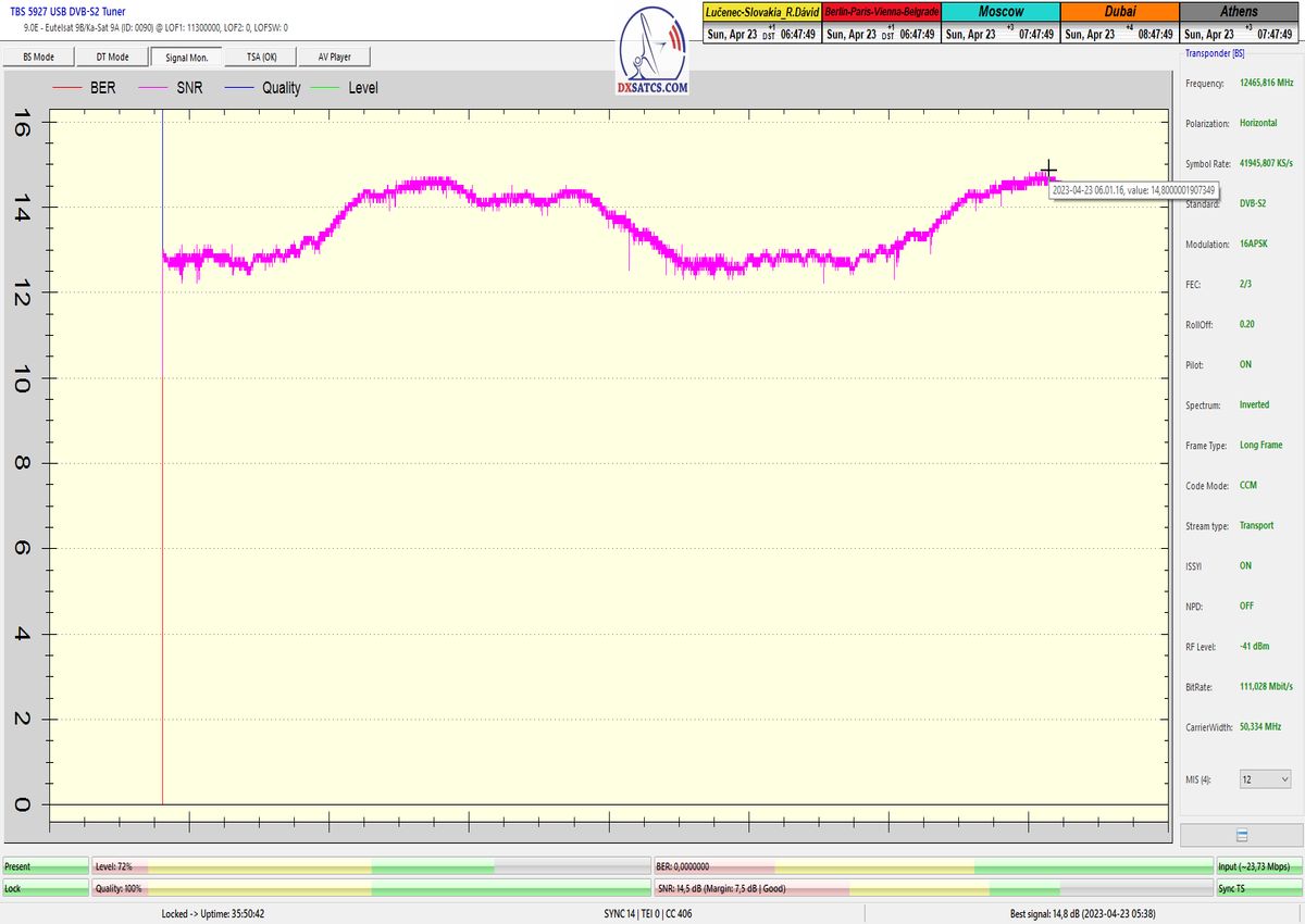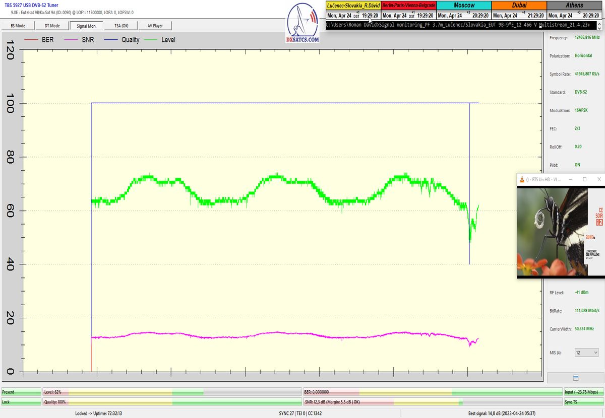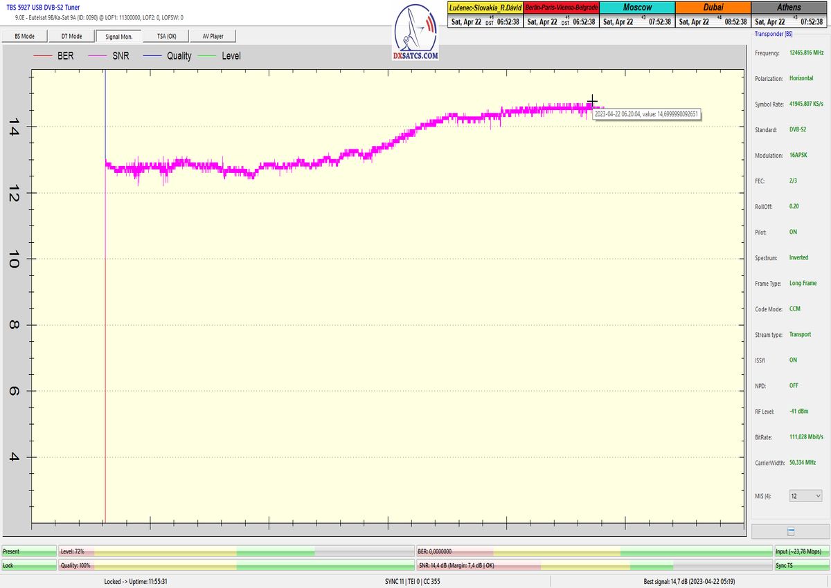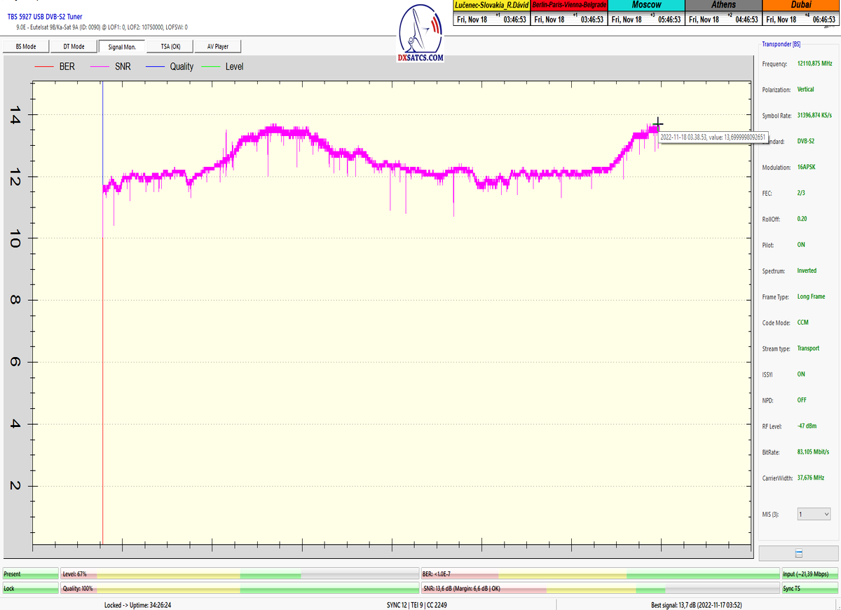 ►v signálnom monitoringu dokázaný a plne stabilný príjem bez jediného výpadku za jednotku t=72 hodín,pri častých dažďových prehánkach a každodenne dosiahnutá špička kvality okolo SNR=13,8 dB s tunerom TBS 5925/5927 alebo okolo MER=14,2 s analyzátorom Metek HD na f=12 111 V .