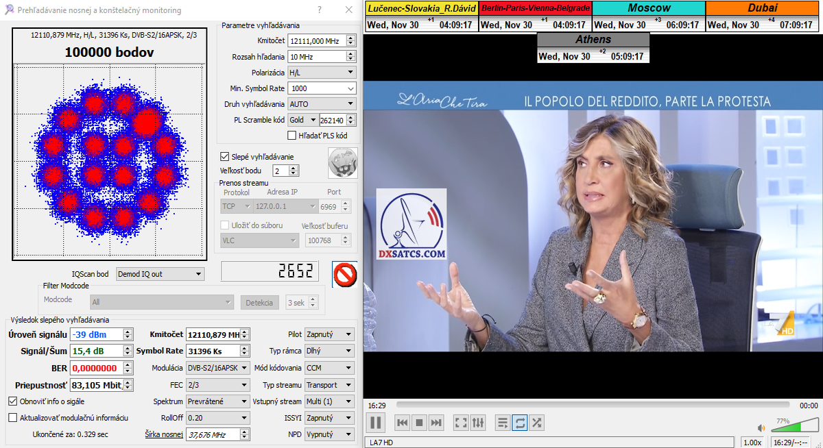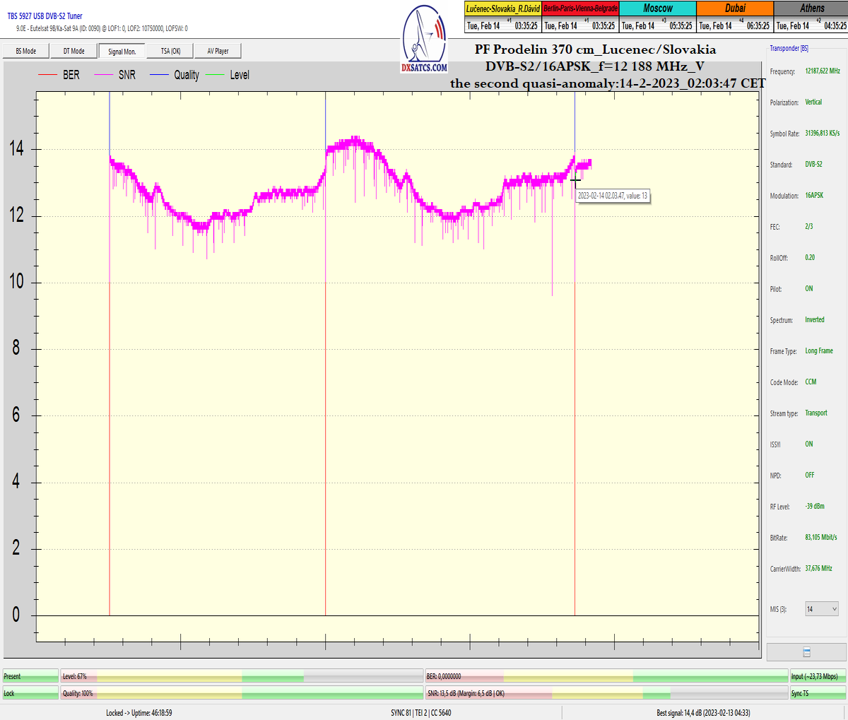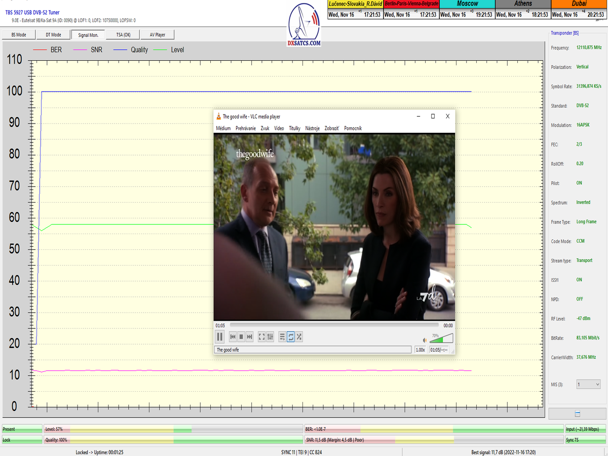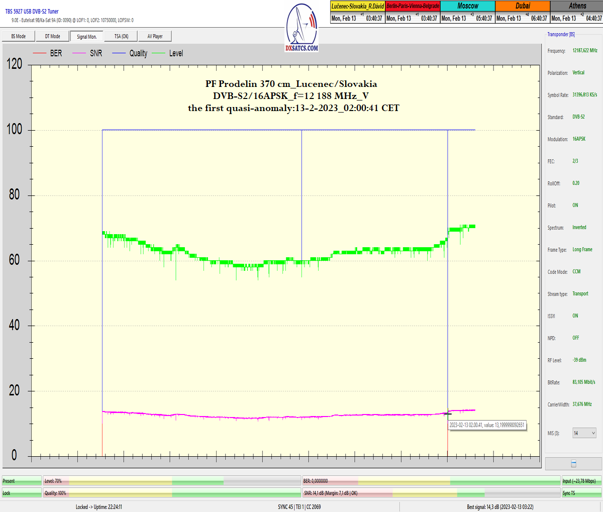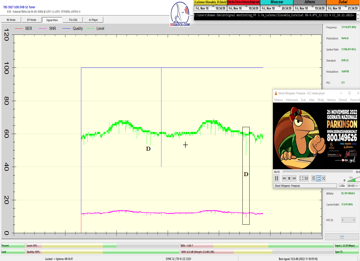 ►v signálnom monitoringu dokázaný a plne stabilný príjem bez jediného výpadku za jednotku t=72 hodín,pri častých dažďových prehánkach a každodenne dosiahnutá špička kvality okolo SNR=13,8 dB s tunerom TBS 5925/5927 alebo okolo MER=14,2 s analyzátorom Metek HD na f=12 111 V .