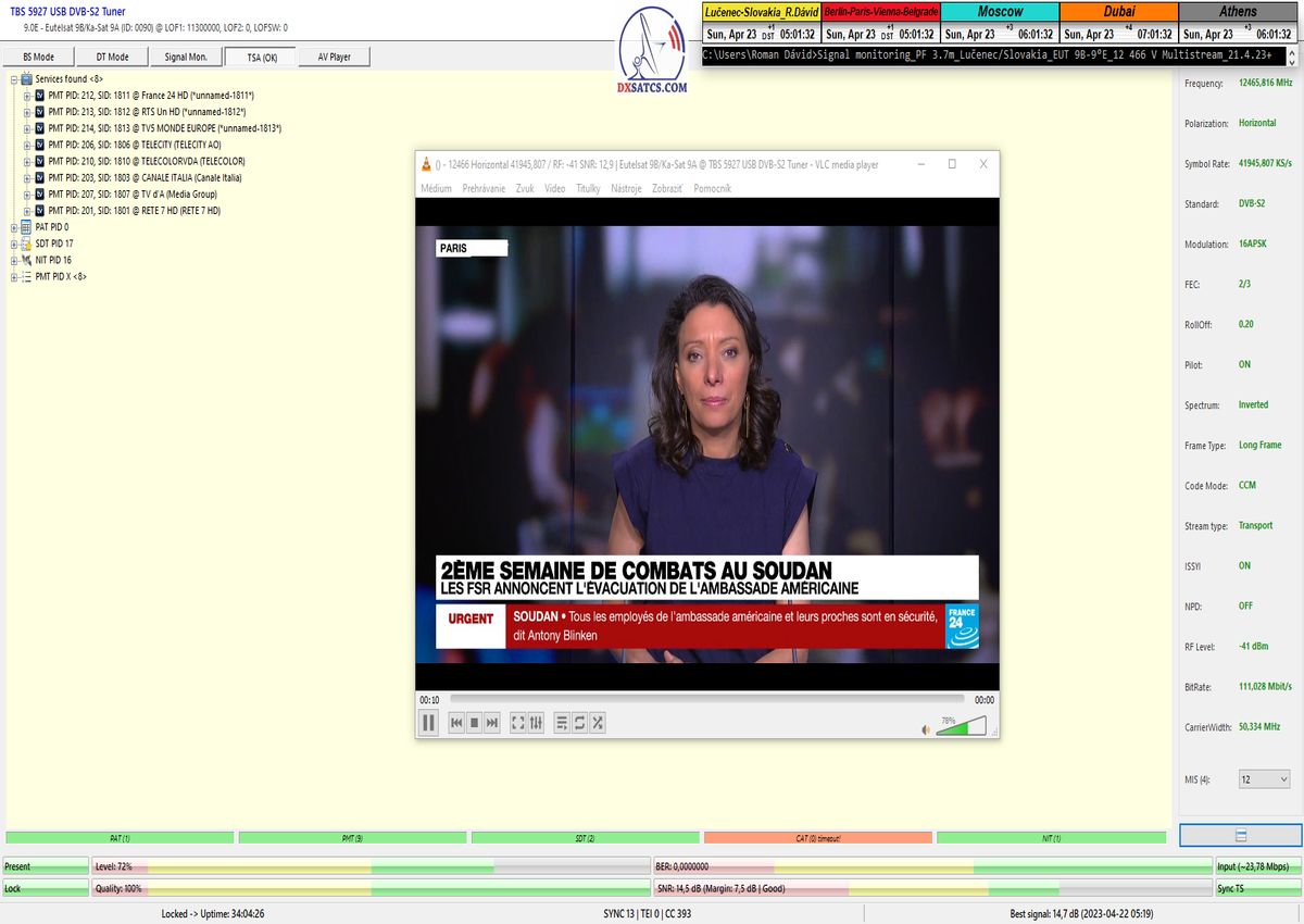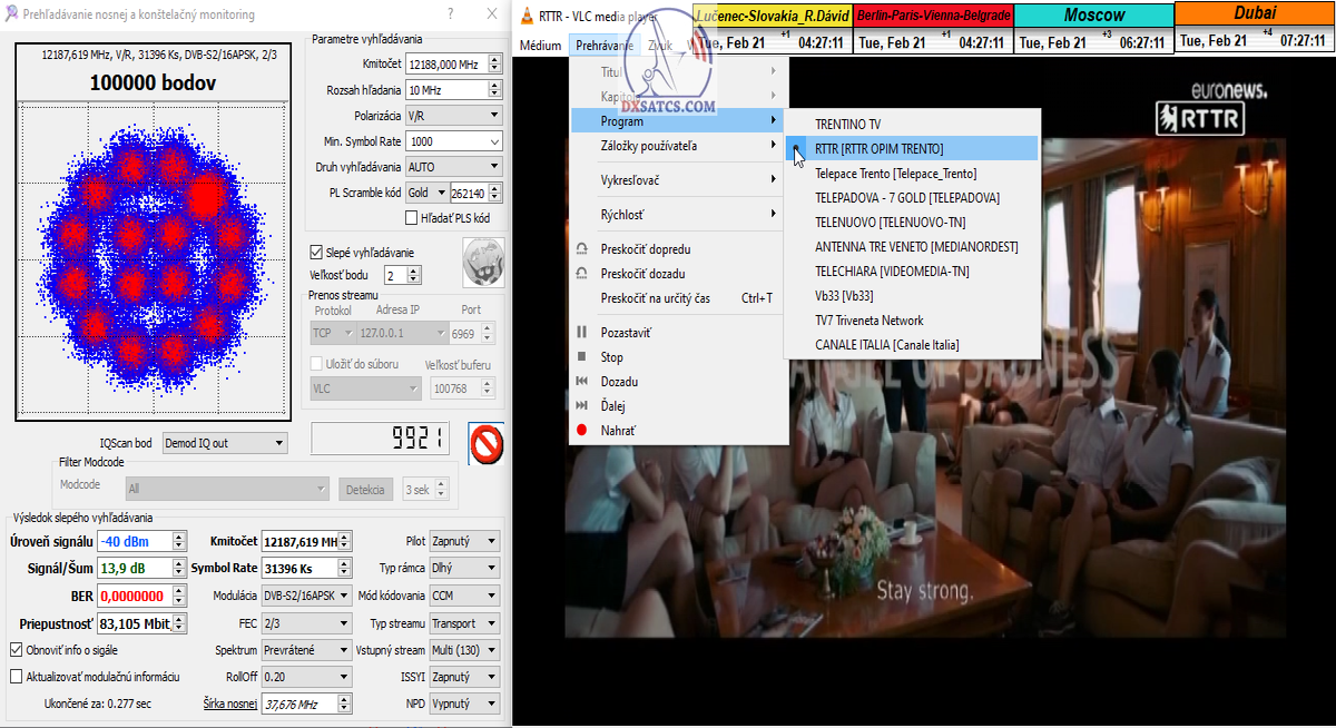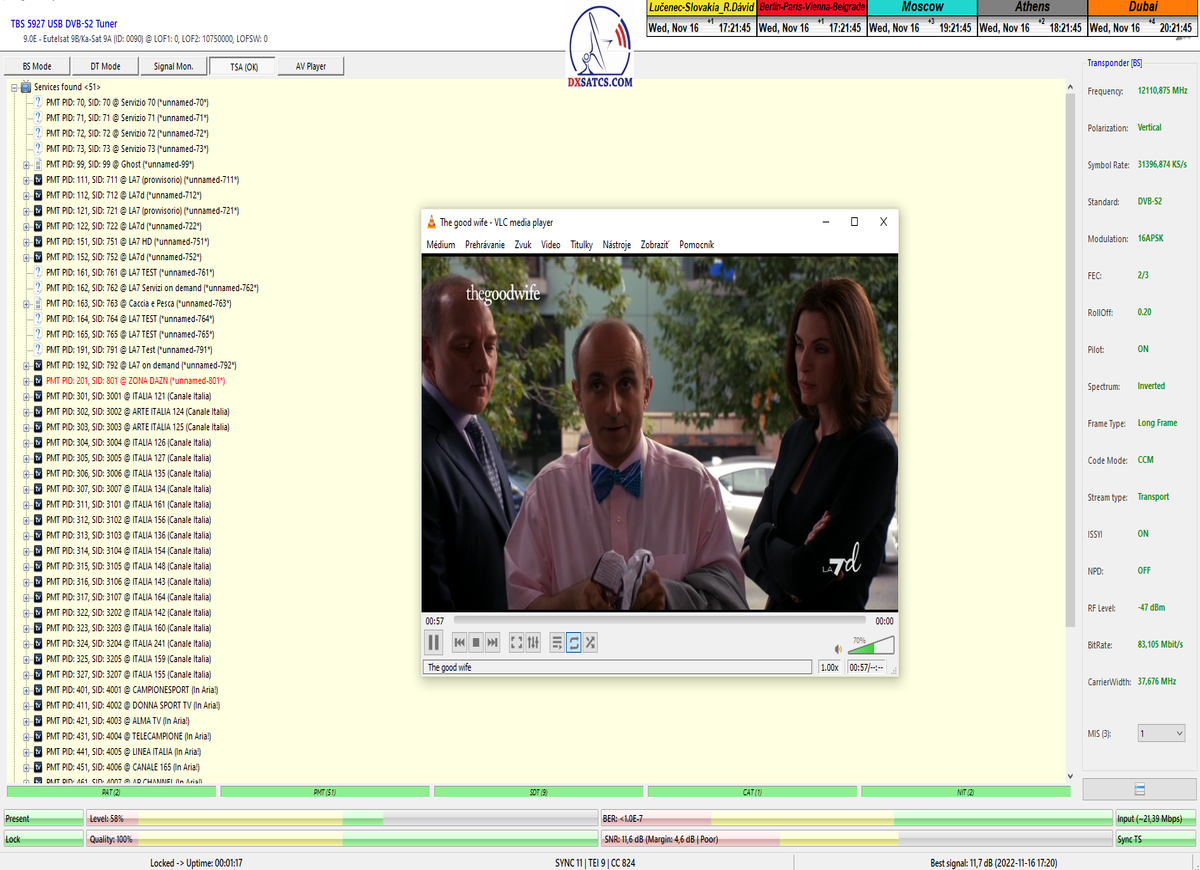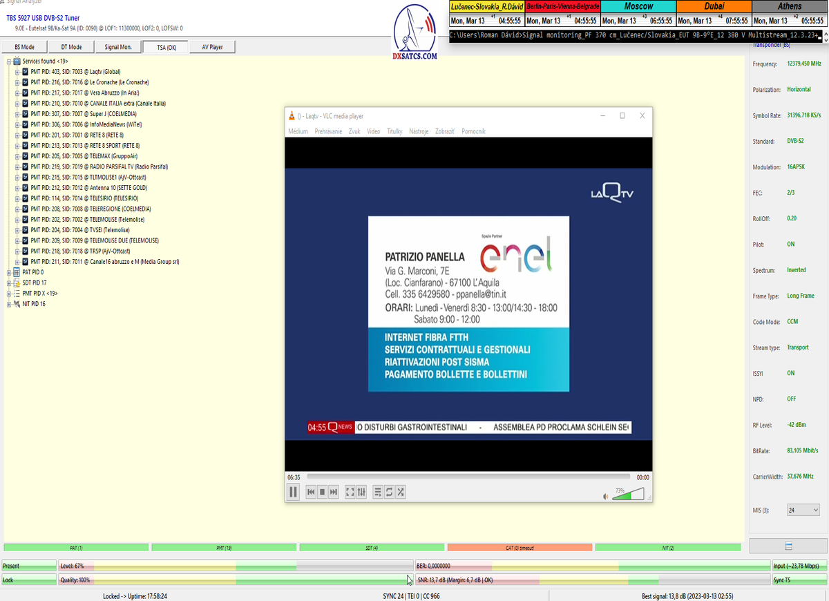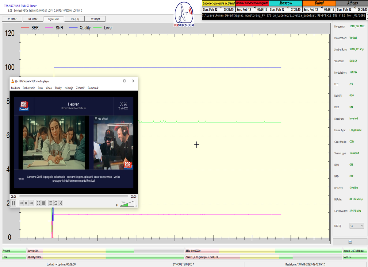 ►v signálnom monitoringu dokázaný a plne stabilný príjem bez jediného výpadku za jednotku t=72 hodín,pri častých dažďových prehánkach a každodenne dosiahnutá špička kvality okolo SNR=13,8 dB s tunerom TBS 5925/5927 alebo okolo MER=14,2 s analyzátorom Metek HD na f=12 111 V .