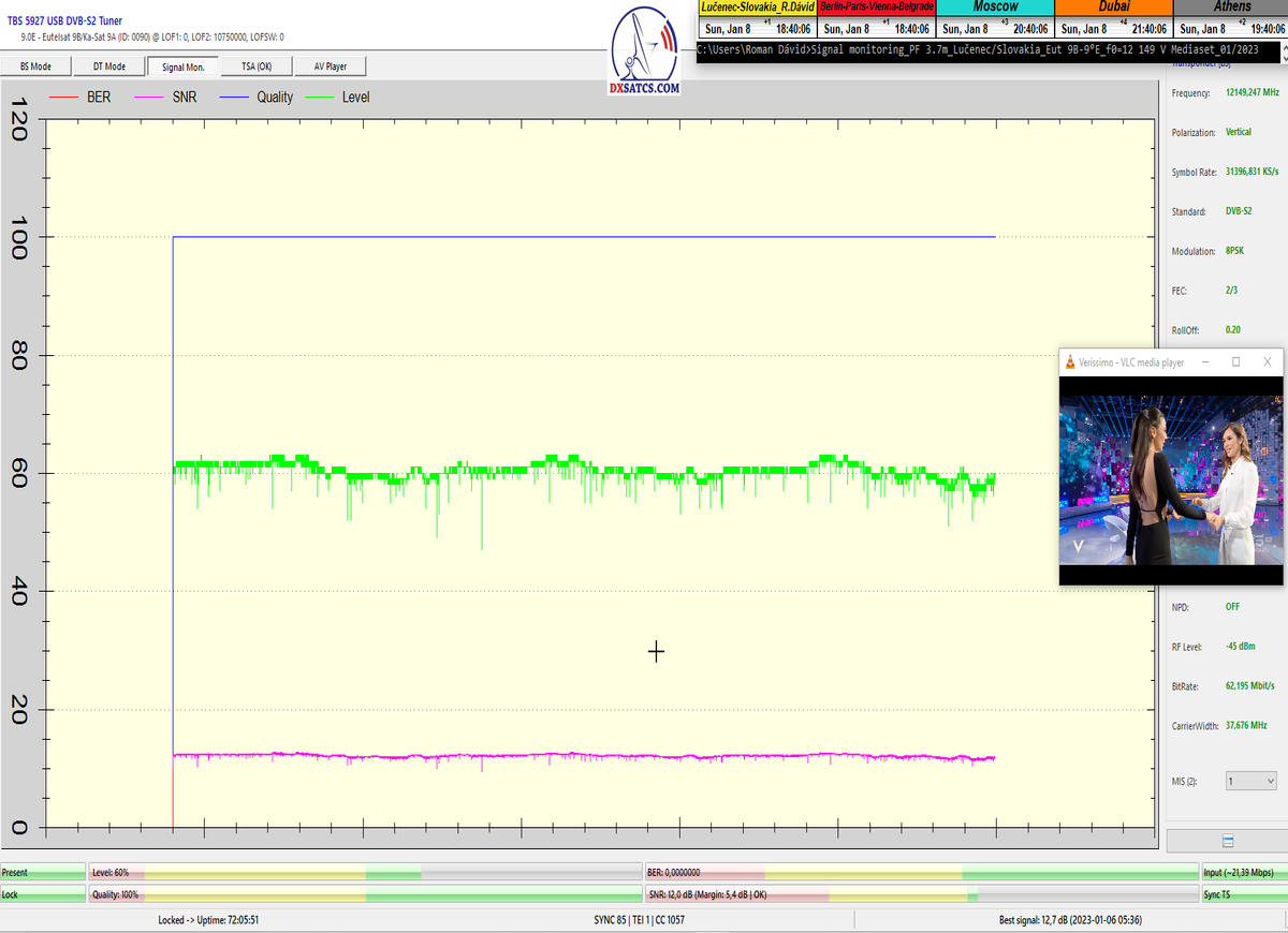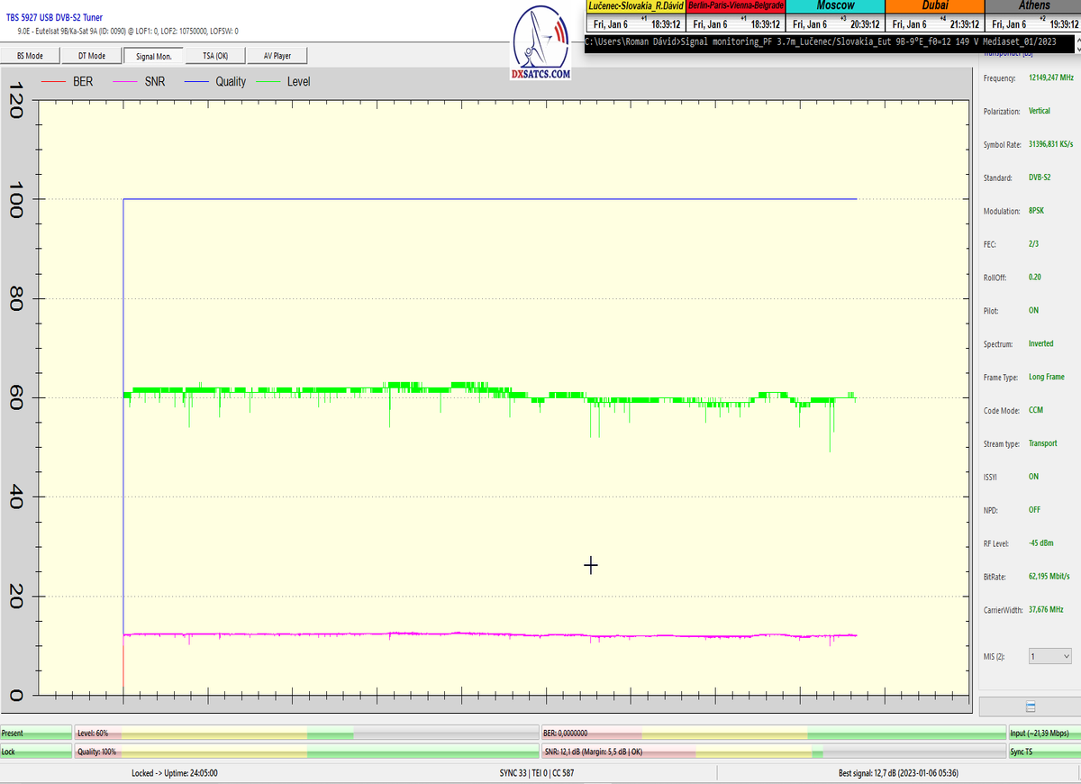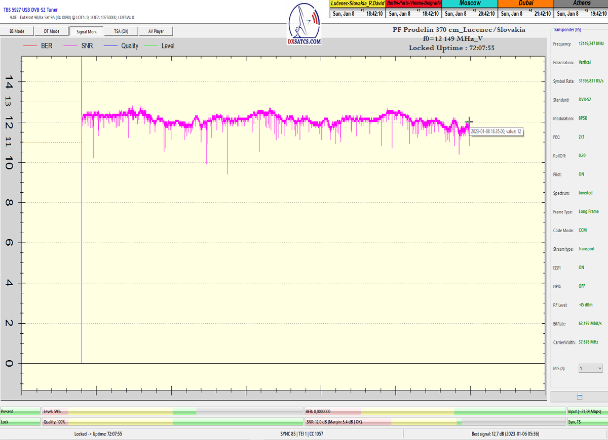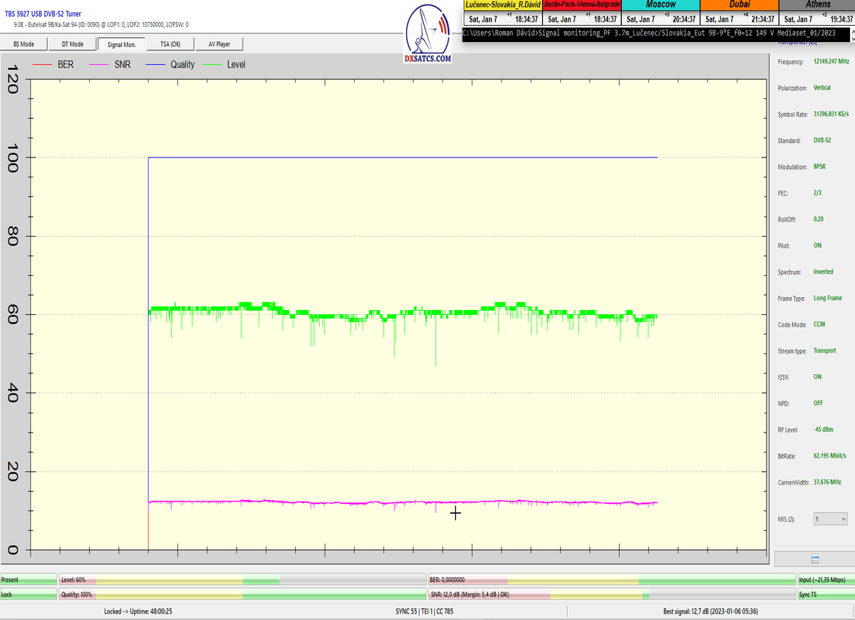 ►Analýza : v prvej polovici časového úseku od 5.1.2023 do 11.1.2023 som koncentroval signálne dáta v kontinuálnom monitoringu v kvantite 1x72 hodín,ktorý má za úlohu nespochybnitelne dokázať exemplárnu a každodennú stabilitu príjmu bez jedinej pixelácie a výpadku v spojitosti priebehu s typickou špičkou kvality od 12,7 do 13 dB v závislosti od okamžitých poveternostných podmienok na výstupes tunera TBS 5927 a v druhej polovici časového úseku od 9.1.2023 do 11.1.2023 som si dal za úlohu dokázať typickú,alebo každodenne sa opakujúcu špičku kvality od MER=13,4 do MER=13,8 dB na výstupe z multistream analyzátora METEK,v závislosti od momentálneho stavu v atmosfére.