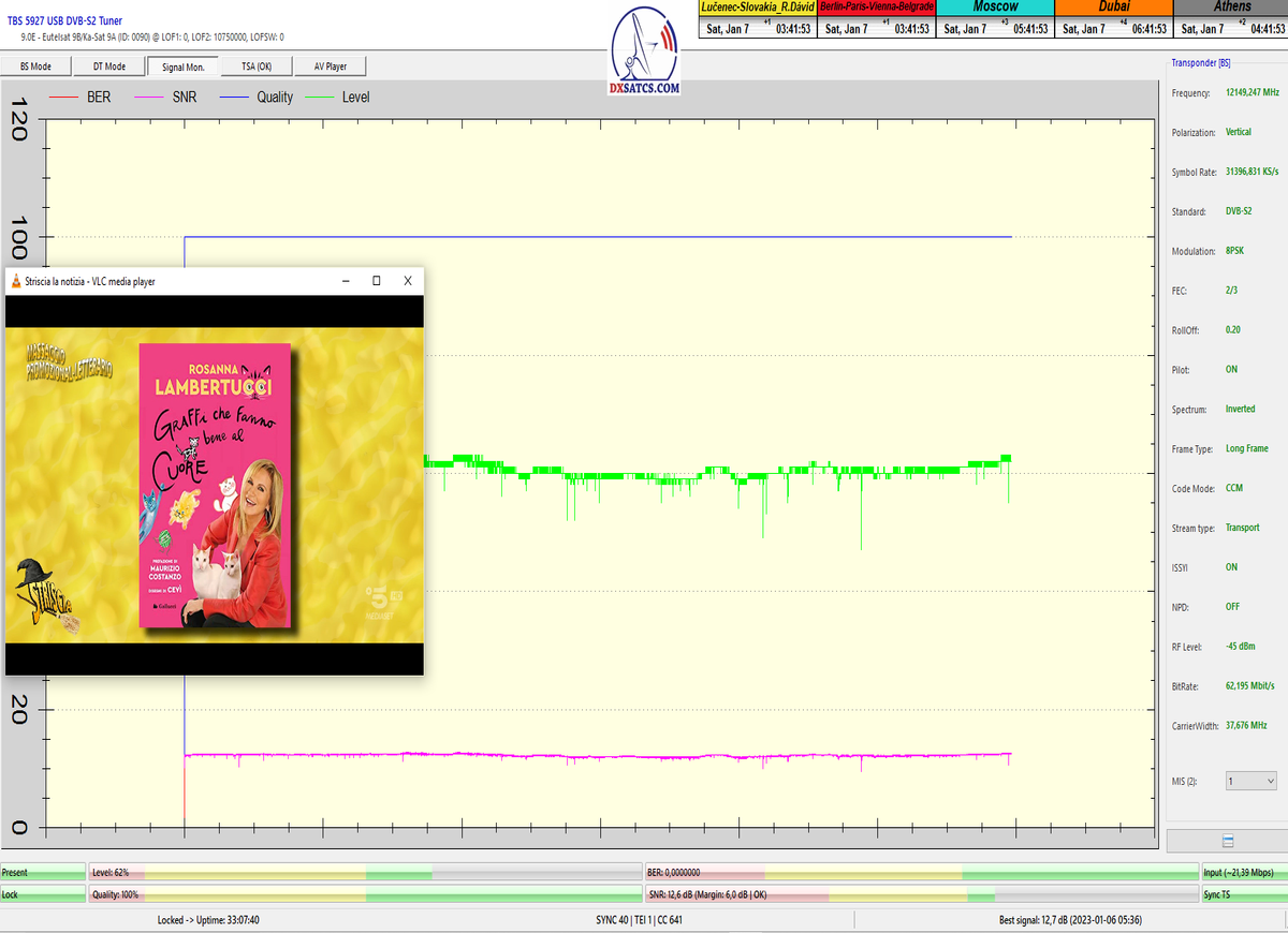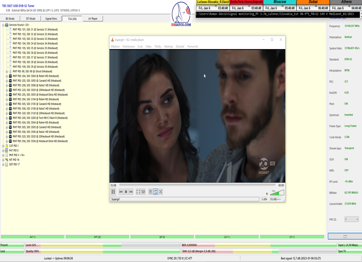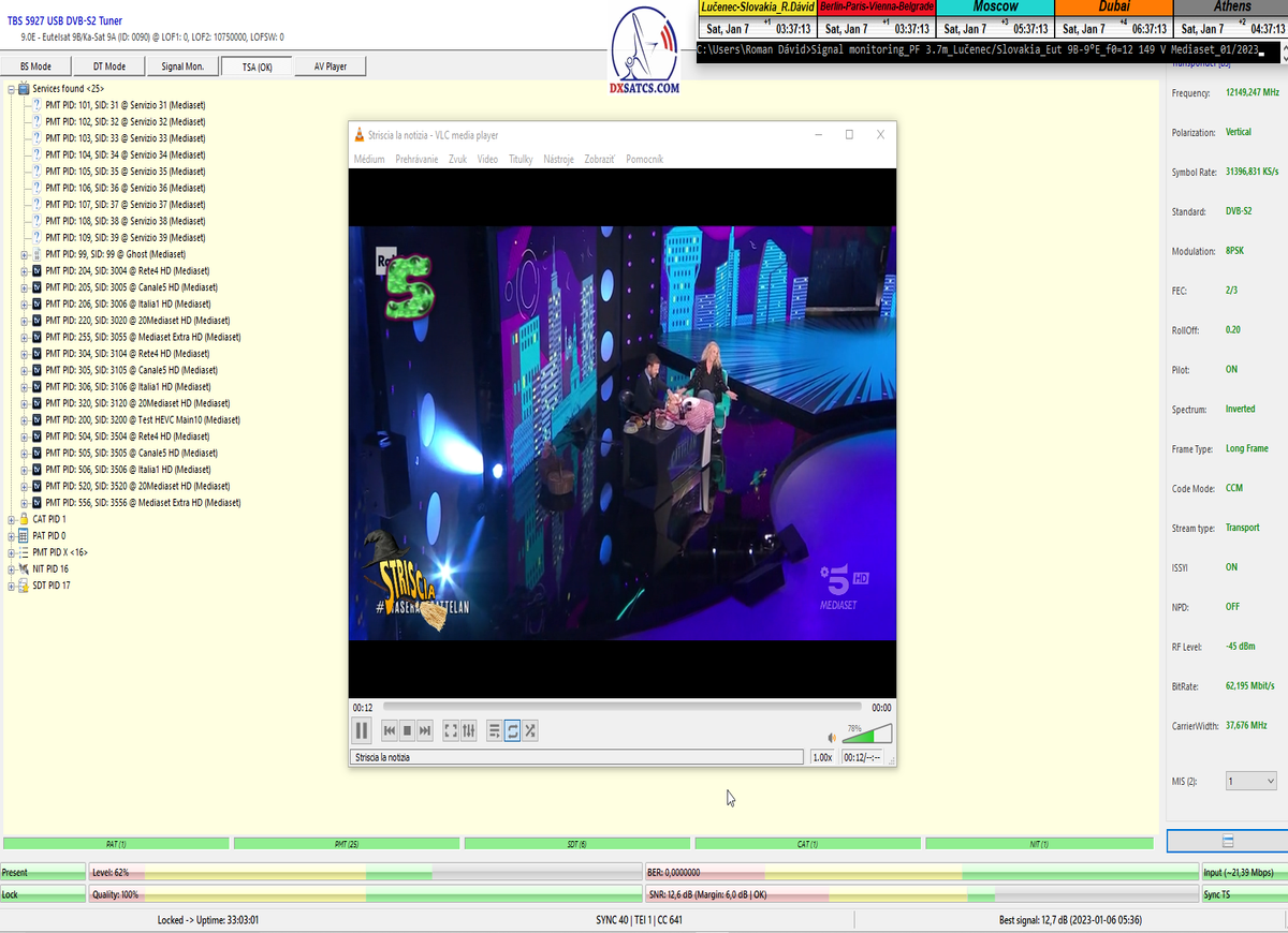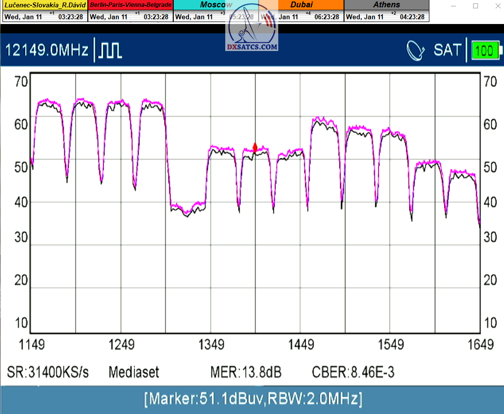 ►Analýza : v prvej polovici časového úseku od 5.1.2023 do 11.1.2023 som koncentroval signálne dáta v kontinuálnom monitoringu v kvantite 1x72 hodín,ktorý má za úlohu nespochybnitelne dokázať exemplárnu a každodennú stabilitu príjmu bez jedinej pixelácie a výpadku v spojitosti priebehu s typickou špičkou kvality od 12,7 do 13 dB v závislosti od okamžitých poveternostných podmienok na výstupes tunera TBS 5927 a v druhej polovici časového úseku od 9.1.2023 do 11.1.2023 som si dal za úlohu dokázať typickú,alebo každodenne sa opakujúcu špičku kvality od MER=13,4 do MER=13,8 dB na výstupe z multistream analyzátora METEK,v závislosti od momentálneho stavu v atmosfére.