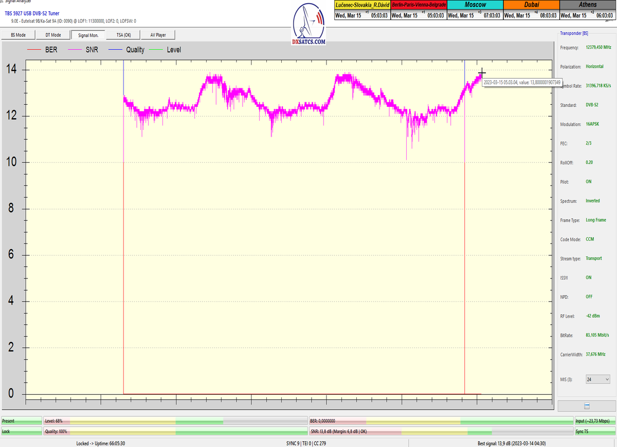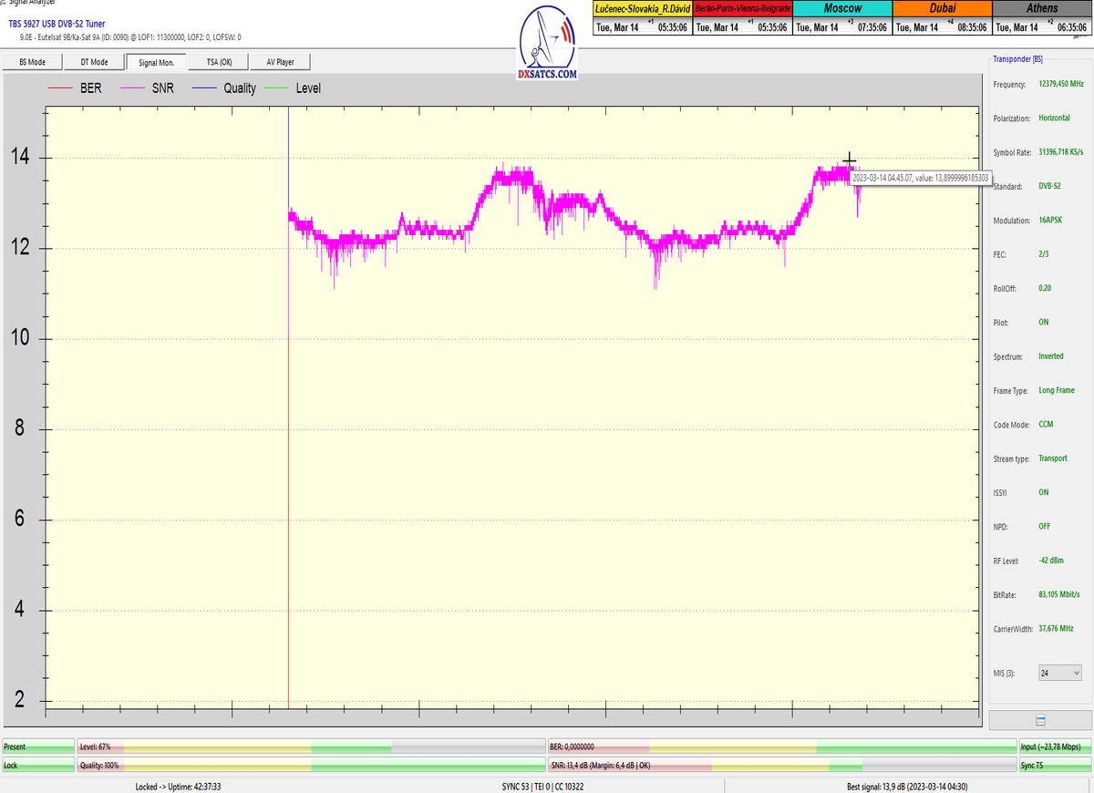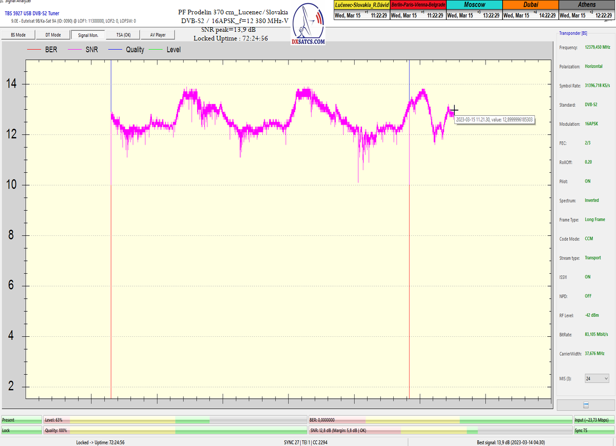 ►22.3.2023 : výsledky signálneho monitoringu frekvencie f=12 380 MHz_V v kvantite t=1x72 hodín na výstupe zo symetrického reflektora s D=370 cm týmto potvrdzujú správnosť mojich predošlých záverov o výskyte javu (ne) cyklických anomálií v rovnakom časovom úseku,alebo inak povedané (ne) pravidelných a dokázateľne vysokých výkonnostných odchýlok-poklesoch od typicky demonštrujúceho sa normálu v intenzite EIRP v danom čase a v danom zemepisnom bode a pravdivosť mojich záverov dokazuje najnovší signálny monitoring v ktorom nie je ani len náznak po jave anomálií,ktorý vznikal a zanikal od cca 12:35 do cca 12:45 SEČ . Pochopiteľne kvantita monitoringu t=72 hodín mi nedovoľuje stanoviť akékoľvek formy kategorických záverov tejto témy,ale s určitosťou môžem potvrdiť že v spomínanom časovom úseku ich predošlého výskytu dnes nie je už ani len náznak po skokovom poklese v intenzite EIRP. Jednu sekundovú mikro-pixeláciu pri úrovni kvality okolo SNR=13,2 dB,ktorá vznikla pri príchode brázdy nízkeho tlaku vzduchu v noci dňa 15.3.2023 (dažďové prehánky) môžem zanedbať a dosiahnutý výsledok klasifikovať ako kvázi exemplárny s každodennou amplitúdou špičky kvality okolo SNR=14 dB na výstupe z DVB-S2 tunera TBS 5927