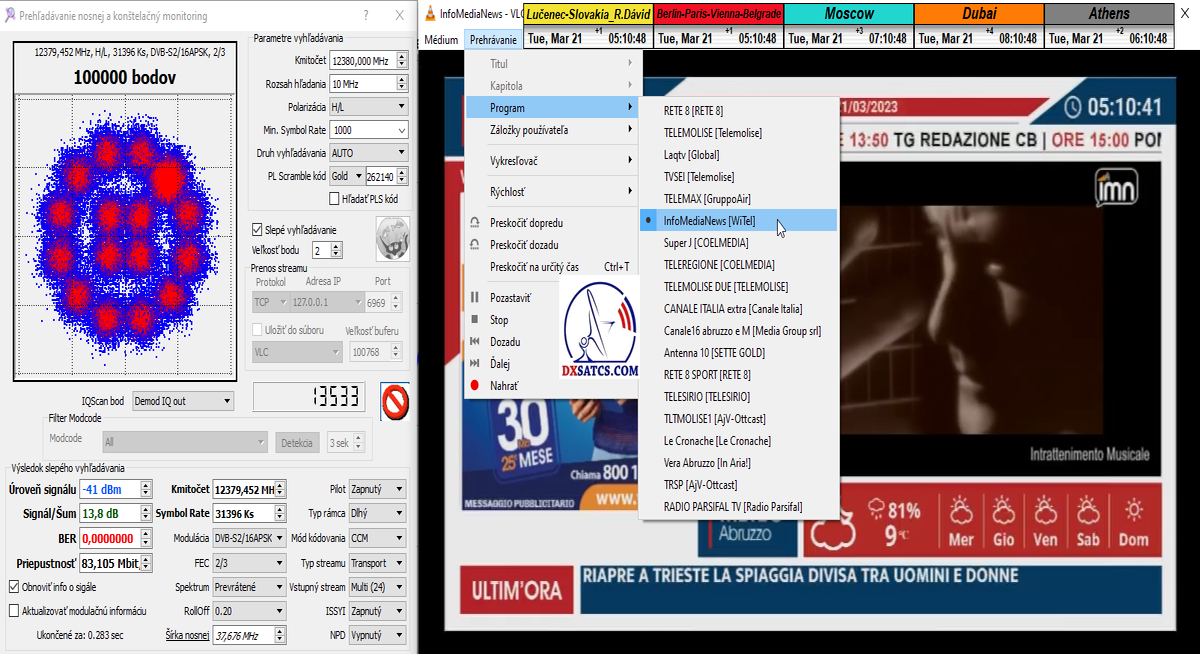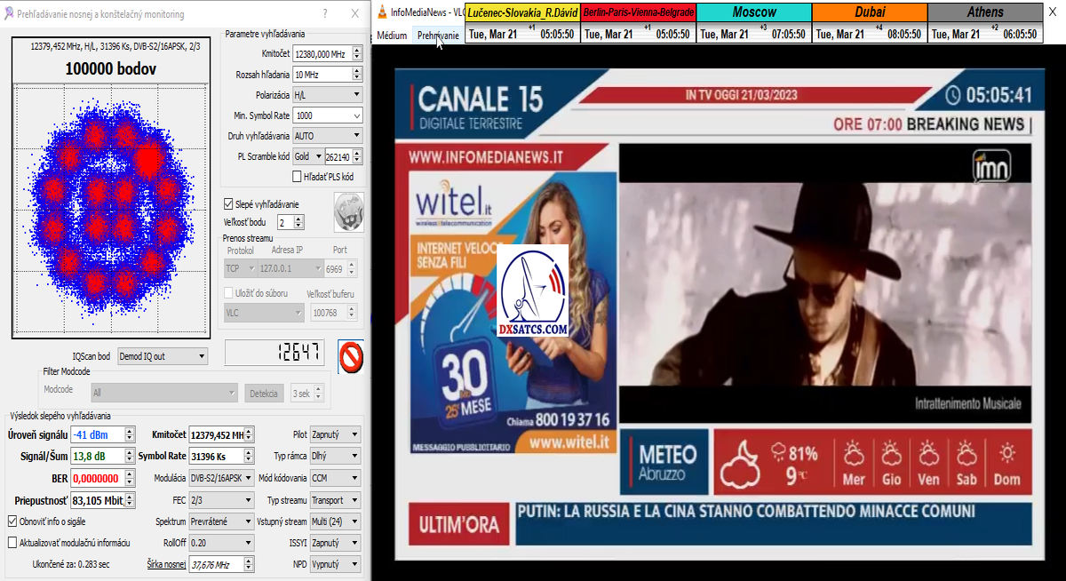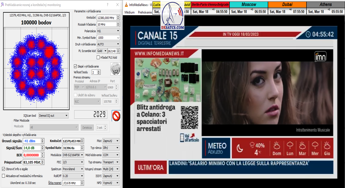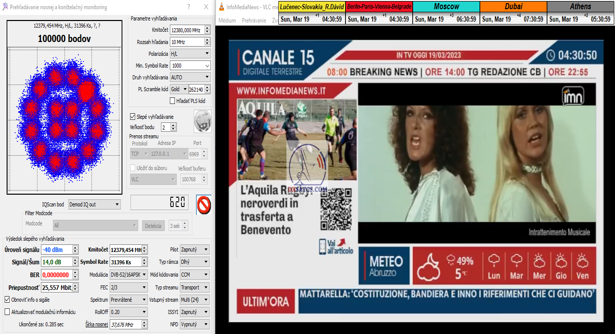 ►22.3.2023 : výsledky signálneho monitoringu frekvencie f=12 380 MHz_V v kvantite t=1x72 hodín na výstupe zo symetrického reflektora s D=370 cm týmto potvrdzujú správnosť mojich predošlých záverov o výskyte javu (ne) cyklických anomálií v rovnakom časovom úseku,alebo inak povedané (ne) pravidelných a dokázateľne vysokých výkonnostných odchýlok-poklesoch od typicky demonštrujúceho sa normálu v intenzite EIRP v danom čase a v danom zemepisnom bode a pravdivosť mojich záverov dokazuje najnovší signálny monitoring v ktorom nie je ani len náznak po jave anomálií,ktorý vznikal a zanikal od cca 12:35 do cca 12:45 SEČ . Pochopiteľne kvantita monitoringu t=72 hodín mi nedovoľuje stanoviť akékoľvek formy kategorických záverov tejto témy,ale s určitosťou môžem potvrdiť že v spomínanom časovom úseku ich predošlého výskytu dnes nie je už ani len náznak po skokovom poklese v intenzite EIRP. Jednu sekundovú mikro-pixeláciu pri úrovni kvality okolo SNR=13,2 dB,ktorá vznikla pri príchode brázdy nízkeho tlaku vzduchu v noci dňa 15.3.2023 (dažďové prehánky) môžem zanedbať a dosiahnutý výsledok klasifikovať ako kvázi exemplárny s každodennou amplitúdou špičky kvality okolo SNR=14 dB na výstupe z DVB-S2 tunera TBS 5927