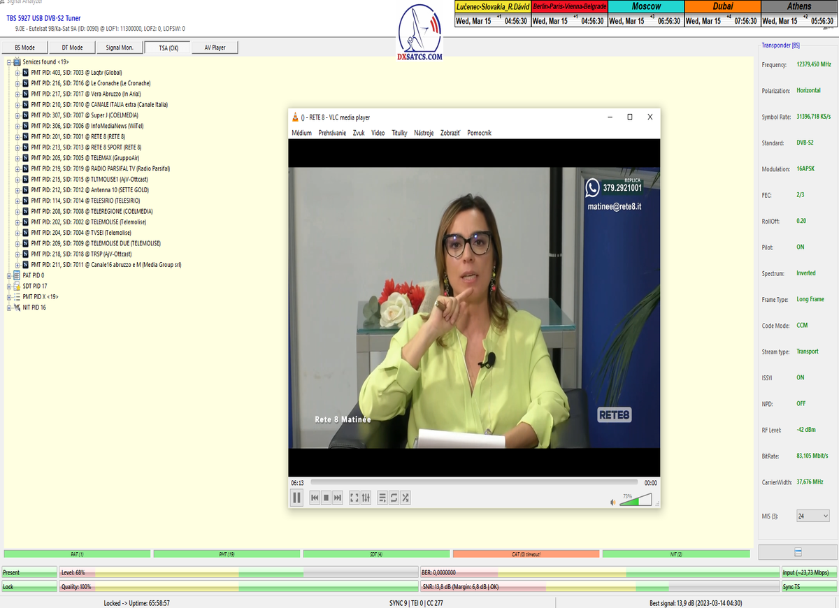 formy príjmu typicky 8-10 hodín,každý monitorovaný deň (bez jedinej pixelácie) so špičkou kvality SNR=7,8-8,2 dB v rozsahu od približne