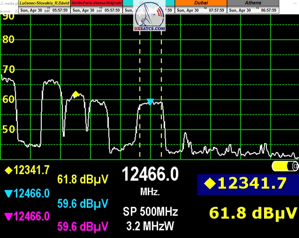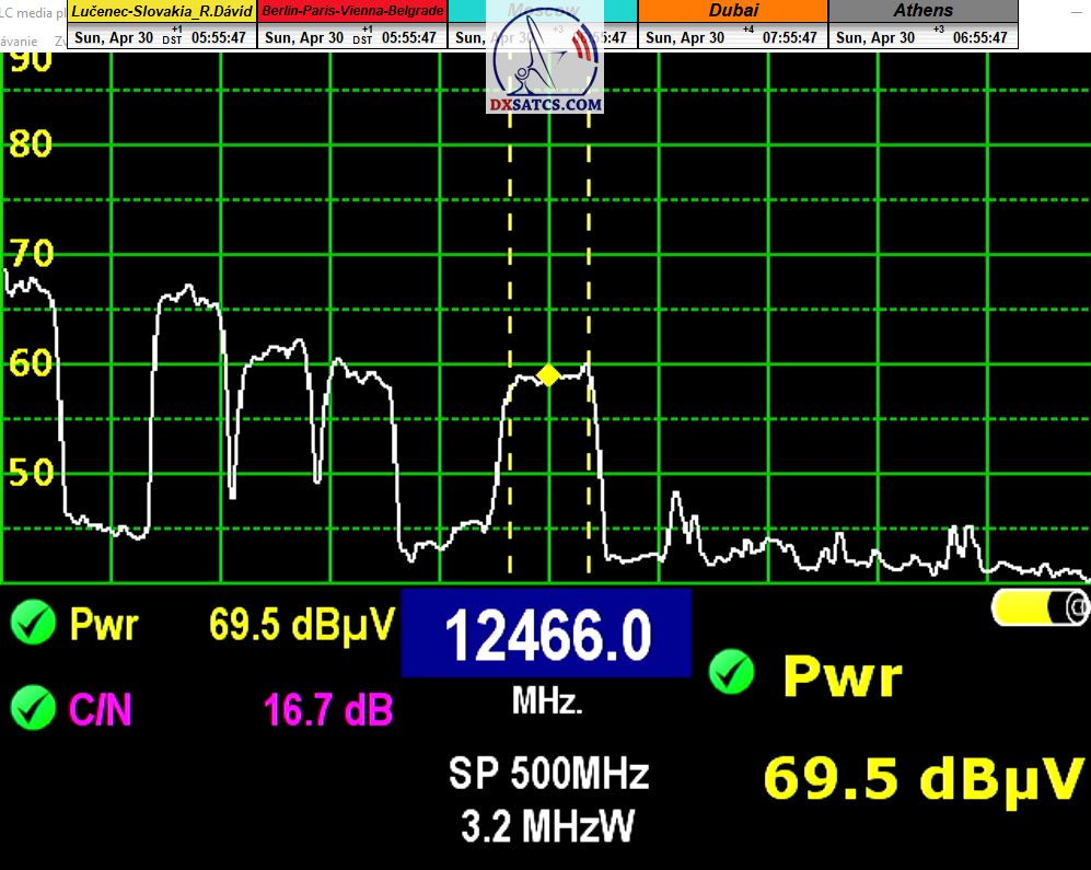 Dôkaz pravdivosti mojich tvrdení : tri dni za sebou v časovom úseku od 4:30 do 06:30 som dosiahol rovnakú špičku kvality MER=15,1 dB na f=12 466 MHz,čo jednoznačne vylučuje faktor výskytu náhodnej špičky výkonu_ 30.4.2023 > 1.5.2023 > 2.5.2023