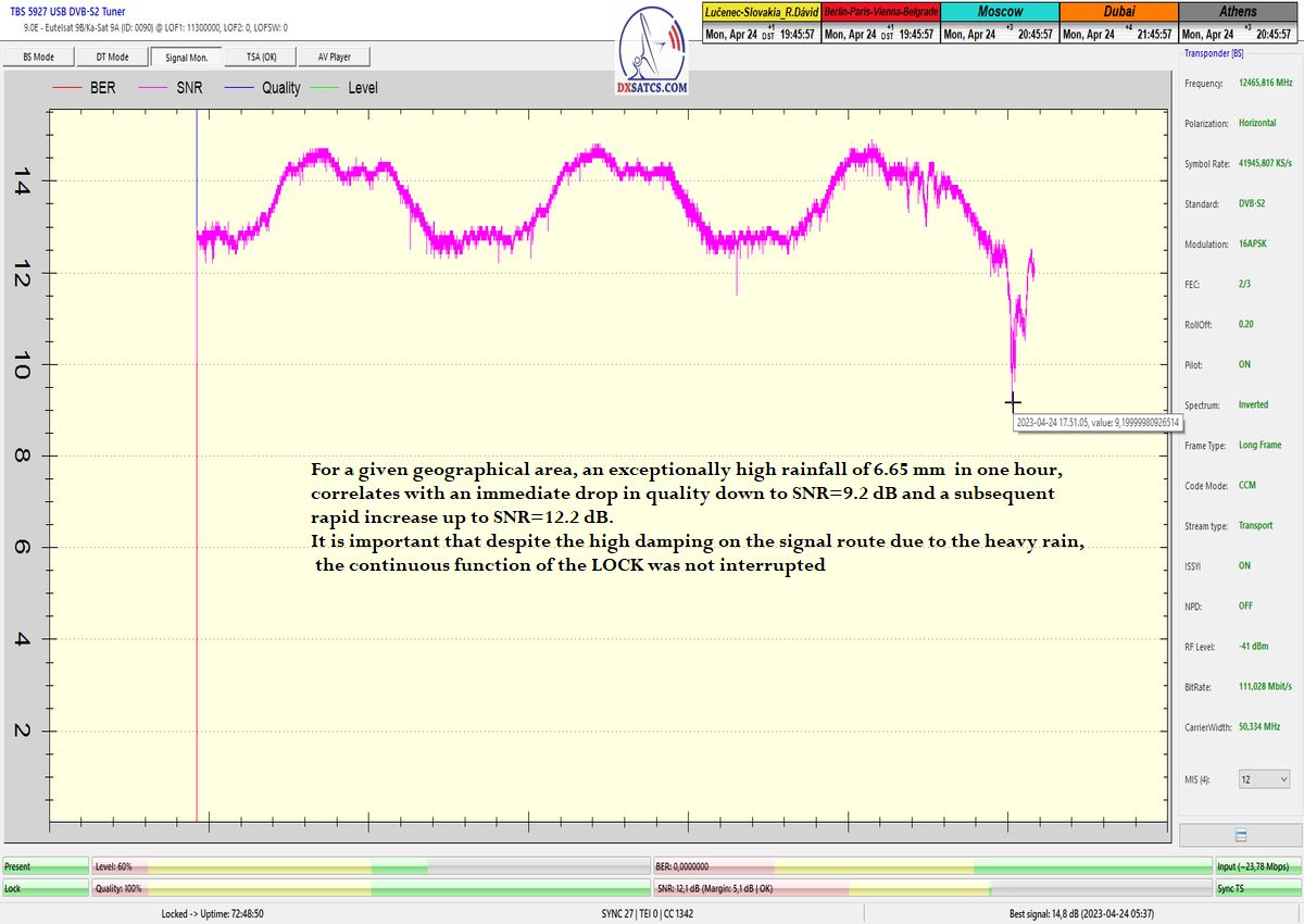 ►Analýza a klasifikácia dosiahnutých výsledkov v percentuálnom vyjadrení : na výstupe zo symetrického reflektora s D=370 cm som dosiahol dokázateľne exemplárny alebo vzorový priebeh klasifikovaný v percentuálnom vyjadrení tvrdením "Stabilný príjem na 100%", v časovom úseku signálneho monitoringu v dĺžke t=72 hodín odvodený od funkcie jedného kontinuálneho LOCKU.Dosiahnutý výsledok je o to cennejší,pretože spojitú funkciu jednotky meraní SNR som dosiahol aj pri výskyte niekoľkých dažďových prehánok a konkrétne jednej s vysokým úhrnom zrážok až 6,65 mm za jednotku t=60 minút dňa 24.4.2023 približne od 17:30 do 19:30 hodine,čo sa z dôvodu vysokej signálnej rezervy demonštrovalo len niekoľkosekundovým poklesom okamžitej kvality zo 100 na 40%.Pravdivosť mojich tvrdení dokazuje sumarizačný graf úhrnu zrážok zo zdroja shmu.sk pre meteorologickú stanicu Boľkovce pri Lučenci,ktorý nespochybniteľne dokazuje vzťah medzi výskytom miernych (v doobedňajších hodinách) ale aj silných dažďových prehánok (v poobedňajších a večerných hodinách) a poklesom kvality až na takmer limit-nú úroveň SNR=9,2 o 17:51 SEČ a následným rapídnym rastom kvality aj pri hustom daždi až na SNR=12,5 dB o 19:32 SEČ.Všetky dnes uverejnené sumarizačné snímky a video ukážky (o priebehu zmien výkonu,kvality a chybovosti) za jednotku t=72 hodín zo signálneho monitoringu som sústredil práve počas výskytu tých najnepriaznivejších poveternostných podmienok a je vysoko pravdepodobné že práve v danom časom úseku sa dosiahol vôbec najvyšší hodinový úhrn zrážok za celý mesiac apríl 2023 pre danú zemepisnú oblasť,ktorú vygenerovala automatická meteorologická stanica druhej generácie AWS 2 Boľkovce.Zo štatistických a sumarizačných tabuliek úhrnu zrážok pre mesiac apríl zo zdrojov meteoblue.sk vyplýva že len približne v dvoch dňoch (2,3) z tridsiatich daných,spadne celkové množstvo zrážok s úhrnom od 5 do 10 mm za 24 hodín,pri celkovo až devätnástich (19,4) úplne suchých dňoch, ale tu hovorím o úhrne zrážok až 6,65 mm