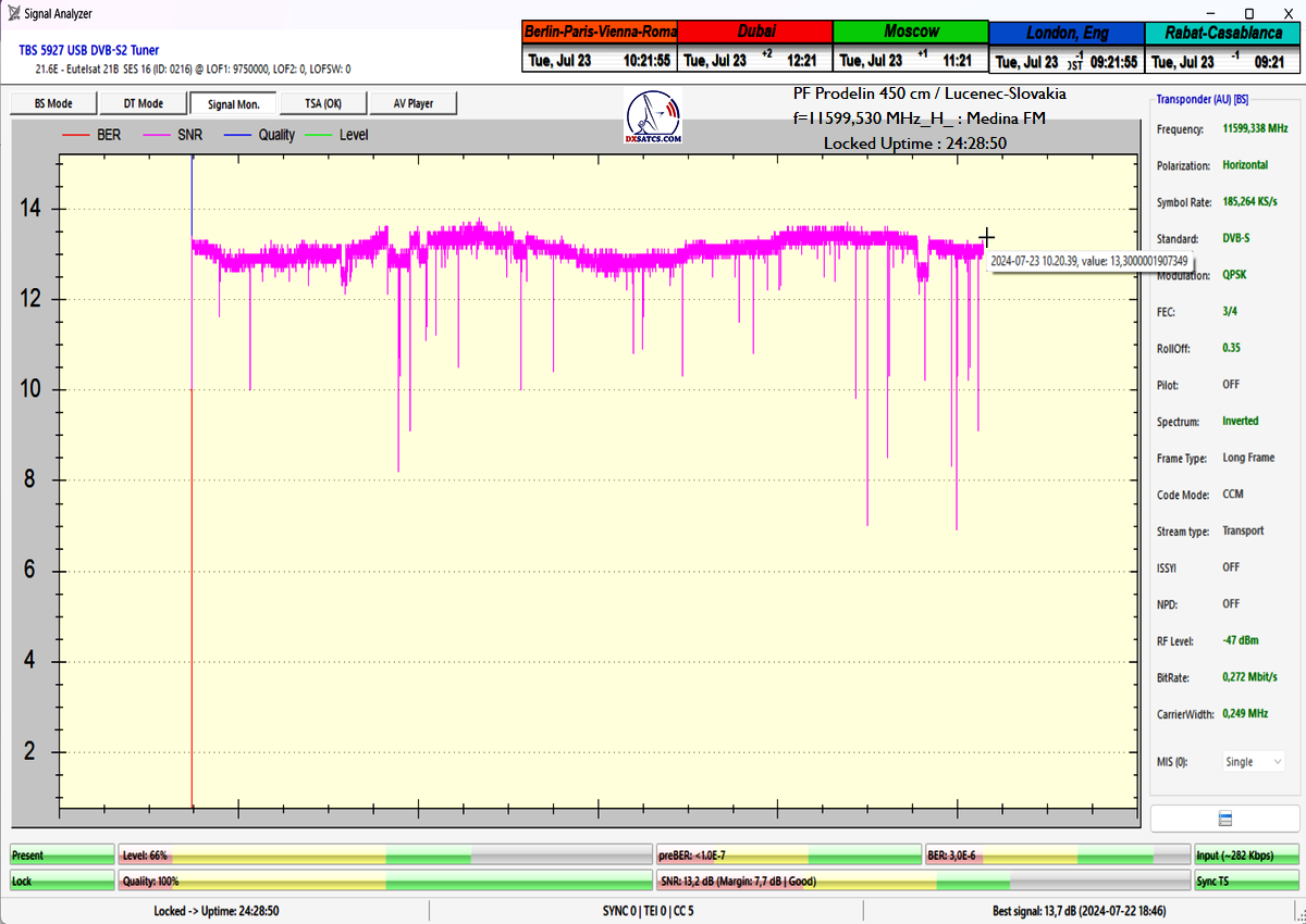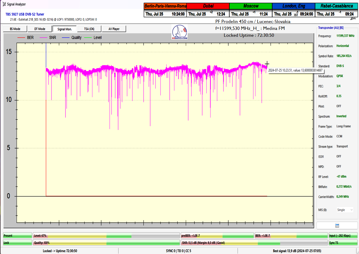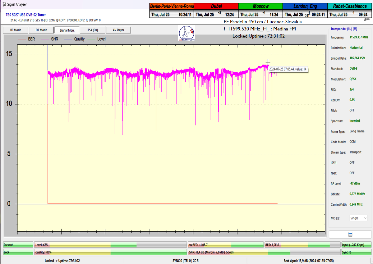 ►Klasifikácia dosiahnutých výsledkov na f=11 599,530 MHz: Vizualizovaná forma dokazovania v celkovej jednotke monitoringu t=97 hodín na rádio nosnej Medina FM na f=11 599,530 MHz s aplikovanou hodnotou SR=185 ksym/sec,týmto nespochybniteľne dokazuje že som dosiahol stabilitu príjmu na 100% bez jediného výpadku v kontinuite Locku nosnej so špičkou kvality SNR=14 dB,pri typickej a permanentne oscilujúcej aplitúde okamžitej rezervy v rozsahu od 7 do 8,5 dB.Vysoký počet v grafe vizualizovaných prepadov v intenzite výkonu a následne kvality,ktoré nijako nesúvisia s prípadným tienením traektórie elektromagnetického vlnenia z družice,(pretože sa opakovali aj na PF 370 s výhľadom na 100% nie len na PF 450 cm)nikdy nedosiahli šumový prah a oscilovali v pásme relatívne vysokej rezervy kvality príjmu.Obsadenie TP DW7 sa zmenilo,v porovnaní s naposledy vykonaným signálnym monitoringom nosnej Medina FM dňa 26.9 > 27.9.2023 + 6.10.2023 > 7.10.2023,čiže nemá význam porovnávať a prípadne vysvetľovať príčiny výrazného rastu dosiahnutej špičky kvality z pôvodnej hladiny SNR=11,4-11,6 na súčasnú špičku SNR=13,9-14 dB,ale faktom ostáva že LNB SMW ostal rovnaký a že som pôvodne použitú polarizačnú výhybku SMW OMT vymenil za : "Romanom Dávidom navrnuté systémové riešenie z roku 2008 tvorené len jedným kusom zlievarenského odliatku (nie z CNC alebo sústruhu),s fyzikálnymi úpravami,ktoré minimalizujú akékoľvek odrazy vlnenia,maximalizujú jeho signálnu priepustnosť,pri vysokej vodivosti tubusu,s konkrétnym zameraním na prevedenie vlnovodnej príruby "