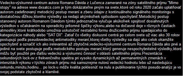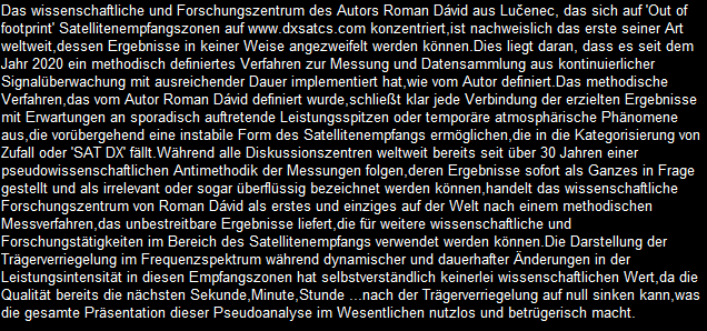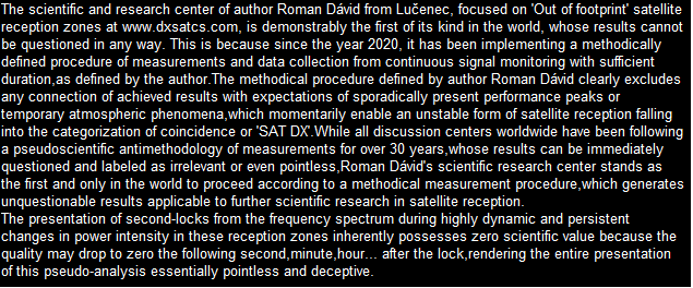 werden seit Jahrzehnten überwiegend in der Kategorisierung des Amateur-Satellitenempfangs angewendet und durch das Kürzel SAT DX gekennzeichnet. Das wissenschaftliche und Forschungszentrum des Autors Roman Dávid aus Lučenec, das sich auf 'Out of footprint' Satellitenempfangszonen auf www.dxsatcs.com konzentriert,ist nachweislich das erste seiner Art weltweit,dessen Ergebnisse in keiner Weise angezweifelt werden können. Dies liegt daran, dass es seit dem Jahr 2020 ein methodisch definiertes Verfahren zur Messung und Datensammlung aus kontinuierlicher Signalüberwachung mit ausreichender Dauer implementiert hat,wie vom Autor definiert.Das methodische Verfahren,das vom Autor Roman Dávid definiert wurde,schließt klar jede Verbindung der erzielten Ergebnisse mit Erwartungen an sporadisch auftretende Leistungsspitzen oder temporäre atmosphärische Phänomene aus,die vorübergehend eine instabile Form des Satellitenempfangs ermöglichen,die in die Kategorisierung von Zufall oder 'SAT DX' fällt.Während alle Diskussionszentren weltweit bereits seit über 30 Jahren einer pseudowissenschaftlichen Antimethodik der Messungen folgen,deren Ergebnisse sofort als Ganzes in Frage gestellt und als irrelevant oder sogar überflüssig bezeichnet werden können, handelt das wissenschaftliche Forschungszentrum von Roman Dávid als erstes und einziges auf der Welt nach einem methodischen Messverfahren, das unbestreitbare Ergebnisse liefert,die für weitere wissenschaftliche und Forschungstätigkeiten im Bereich des Satellitenempfangs verwendet werden können.Die Darstellung der Trägerverriegelung im Frequenzspektrum während dynamischer und dauerhafter Änderungen in der Leistungsintensität in diesen Empfangszonen hat selbstverständlich keinerlei wissenschaftlichen Wert,da die Qualität bereits die nächsten Sekunde,Minute,Stunde ... nach der Trägerverriegelung auf null sinken kann,was die gesamte Präsentation dieser Pseudoanalyse im Wesentlichen nutzlos und betrügerisch macht.