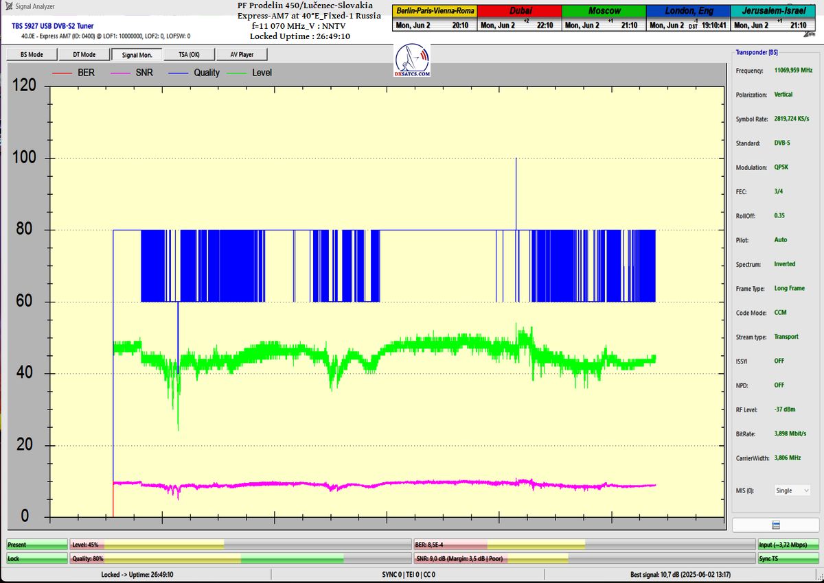 ENG_The results of signal monitoring unequivocally confirm that during the verification interval of t = 77 hours, for the NNTV carrier frequency at f = 11,070 MHz_V, I demonstrably achieved 100% stable reception without a single occurrence of signal loss related to Lock status or pixelation.A peak SNR quality of 10.7 dB was recorded, and the only instance of a drop in the blue Q-quality curve to the level of Q = 40% occurred exactly once — following the arrival of storm cloud cover and the onset of rain showers on June 1, 2025 at precisely 20:35 CET, as irrefutably verified by precipitation data from the source shmu.sk.
