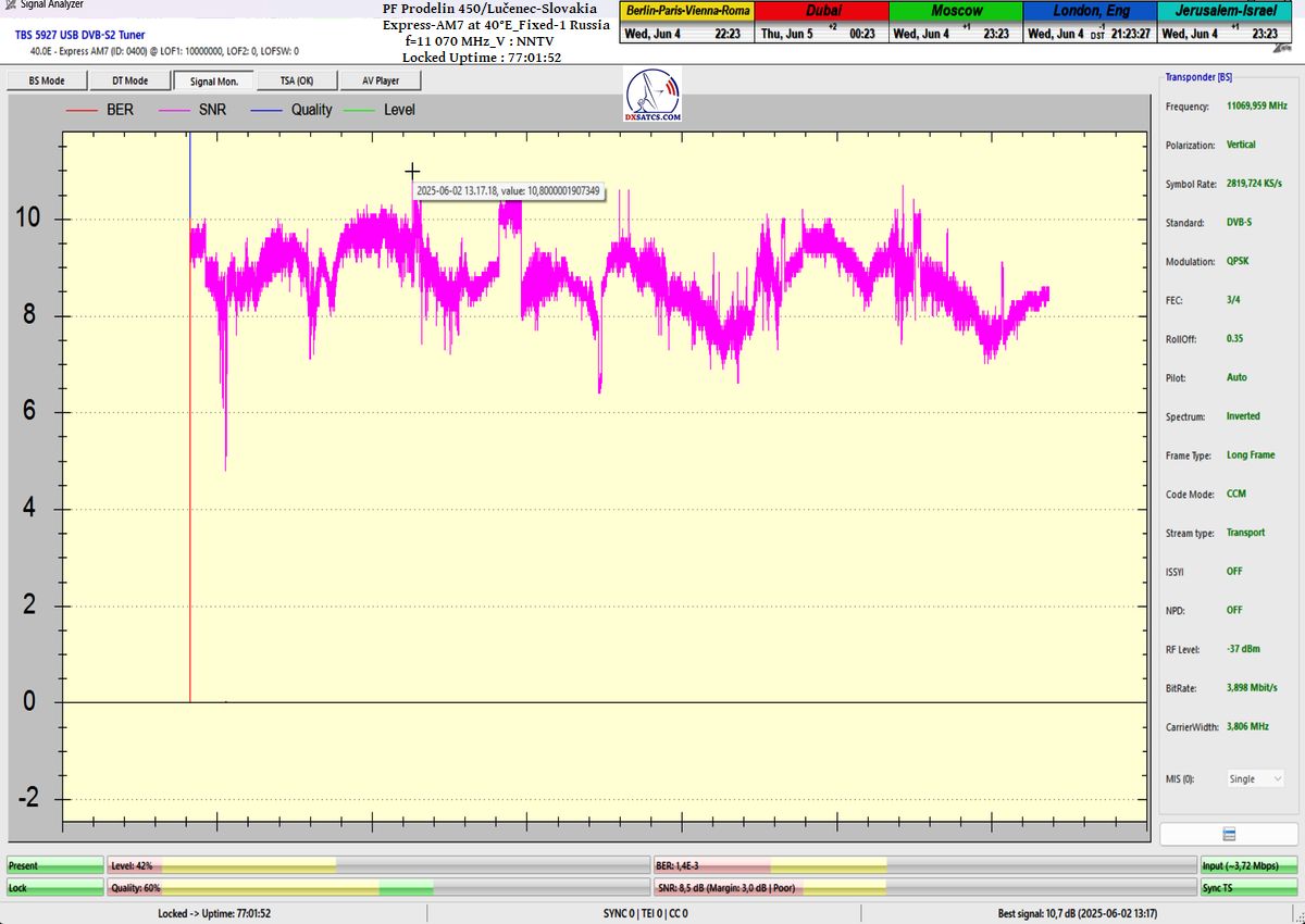 SK_Výsledky signálneho monitoringu nespochybnitelne dokazujú že som v jednotke monitoringu t=77 hodín,nosnej frekvencie NNTV na f=11 070 MHz_V, dokázatelne dosiahol stabilný príjem na 100% bez výskytu čo i len jedného výpadku v spojitosti priebehu funkcie Locku alebo pixelácie. Zaznamenal som špičku kvality SNR=10,7 dB a jediný výskyt poklesu modrého priebehu kvality Q na hladinu Q=40% sa odohral presne 1x a to po príchode búrkovej oblačnosti a výskyte dažďových prehánok dňa 1.6.2025 presne o 20:35 SEČ,čo nespochybniteľne dokazujú výsledky meraní úhrnu zrážok zo zdroja shmu.sk.