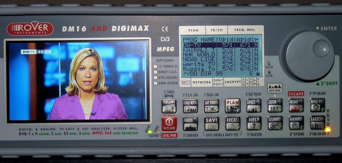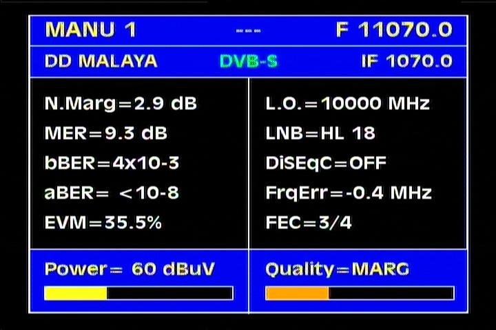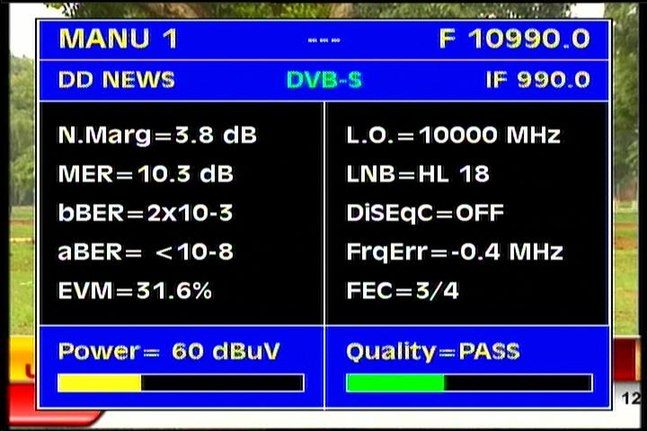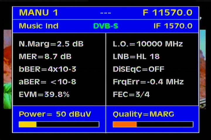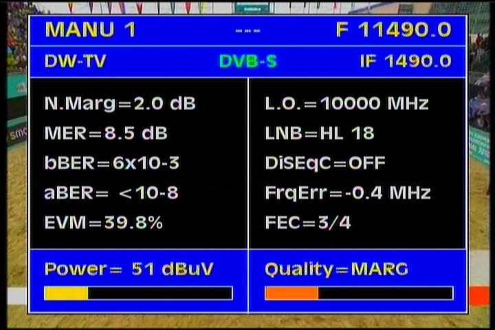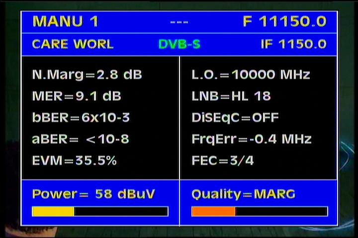 of reception follows.Average reception quality, expressed in the unit MER=9.5-11.5 dB (with occasional peak at MER=15+ dB)