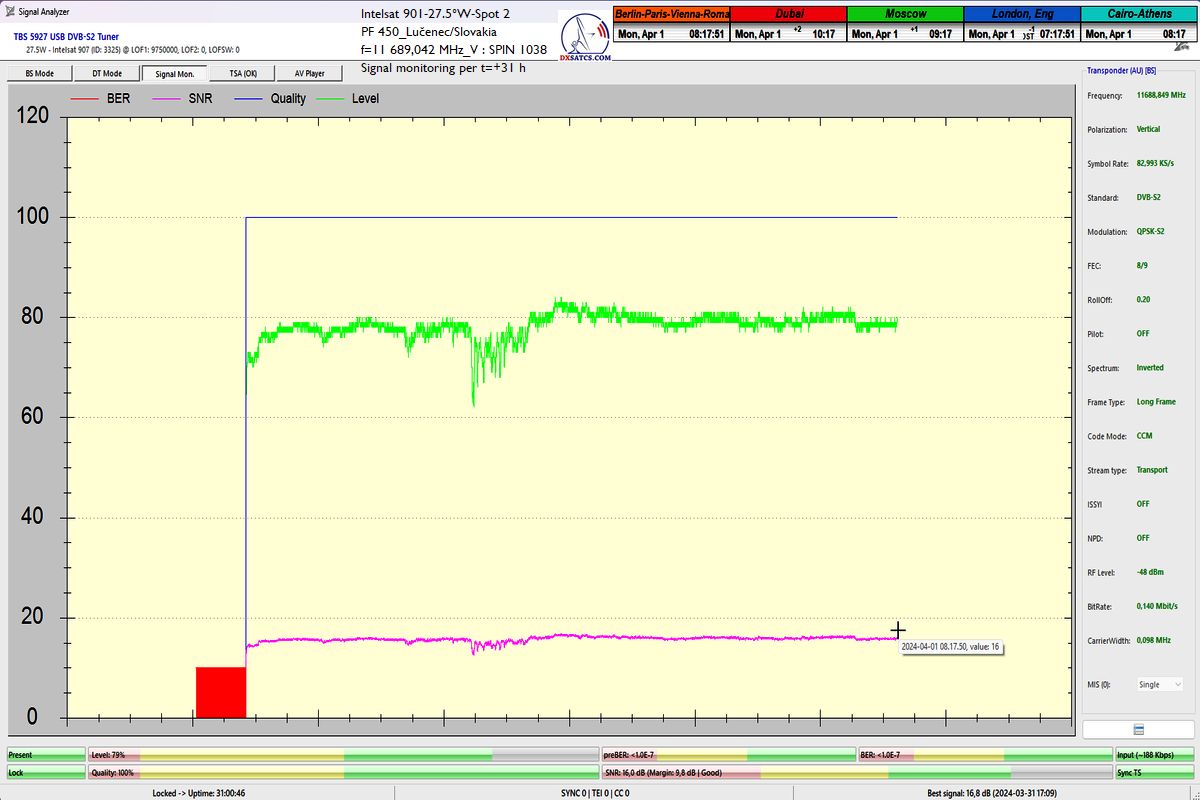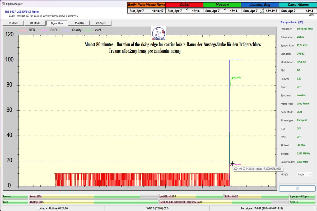 že som dosiahol jeden konštantný priebeh LOCK-u so špičkou kvality SNR=17 dB,bez jediného výpadku v kontinuite kvality Q, inak povedané dôkazná