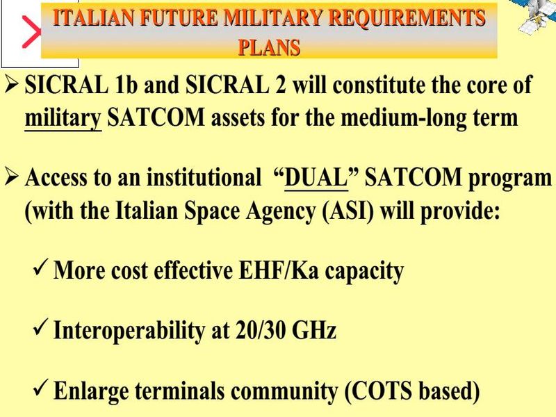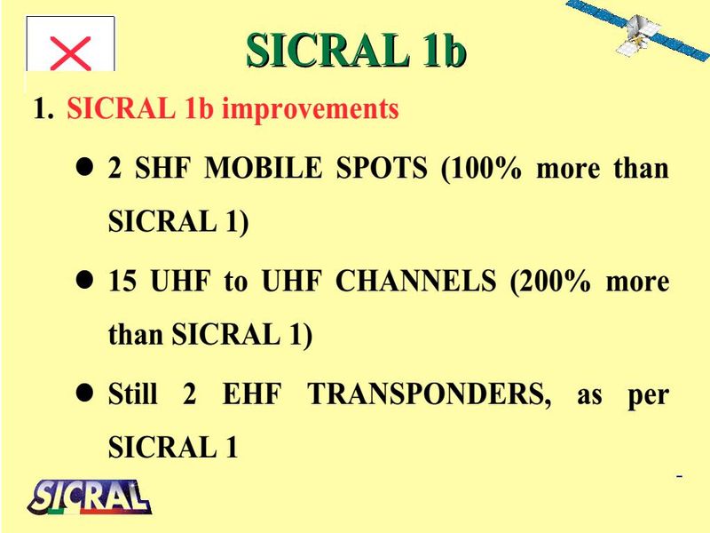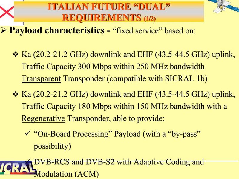 spektre vojenského objektu Sicral 1B na orbite λ=11.8°E a operuje v spektre pásiem UHF,SHF a EHF .